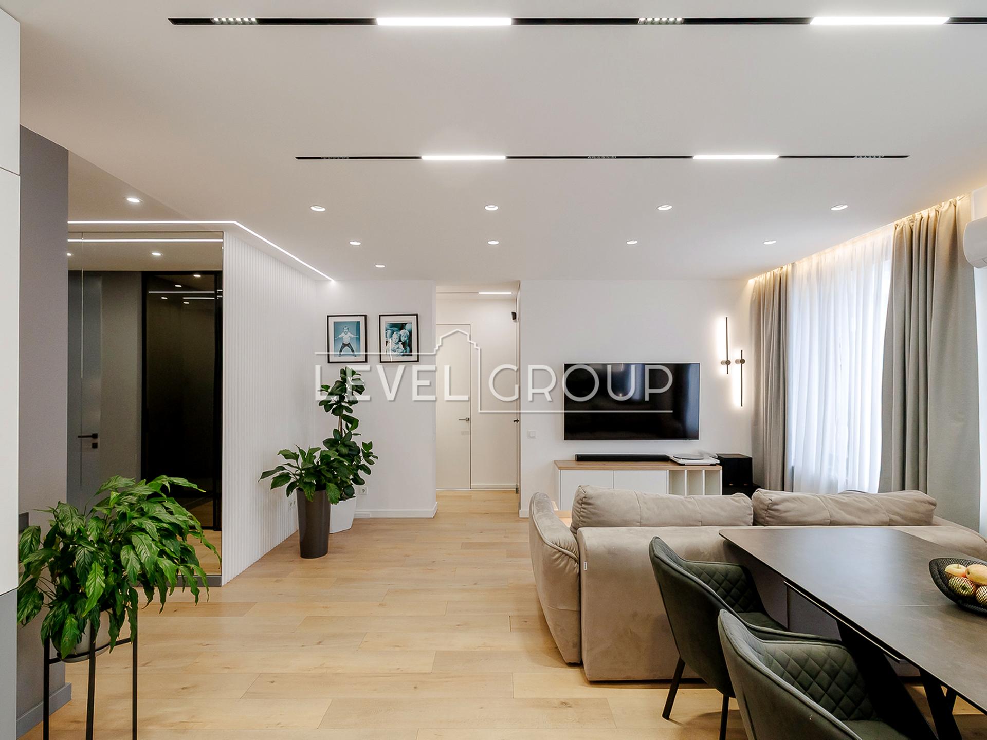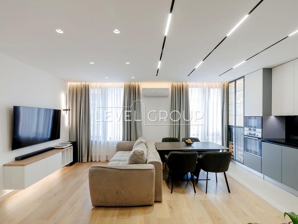 Дизайнерський ремонт, якісні меблі: двоспальне ліжко, дворівневе ліжко, письмовий стіл, розкладна софа, вмонтована шафа, диван в кухні-студії, розкладний стіл зі штучного каменю; техніка: посудомийна машина, варильна панель, духова шафа, витяжка, чотири кондиціонери, охоронна система Ajax.