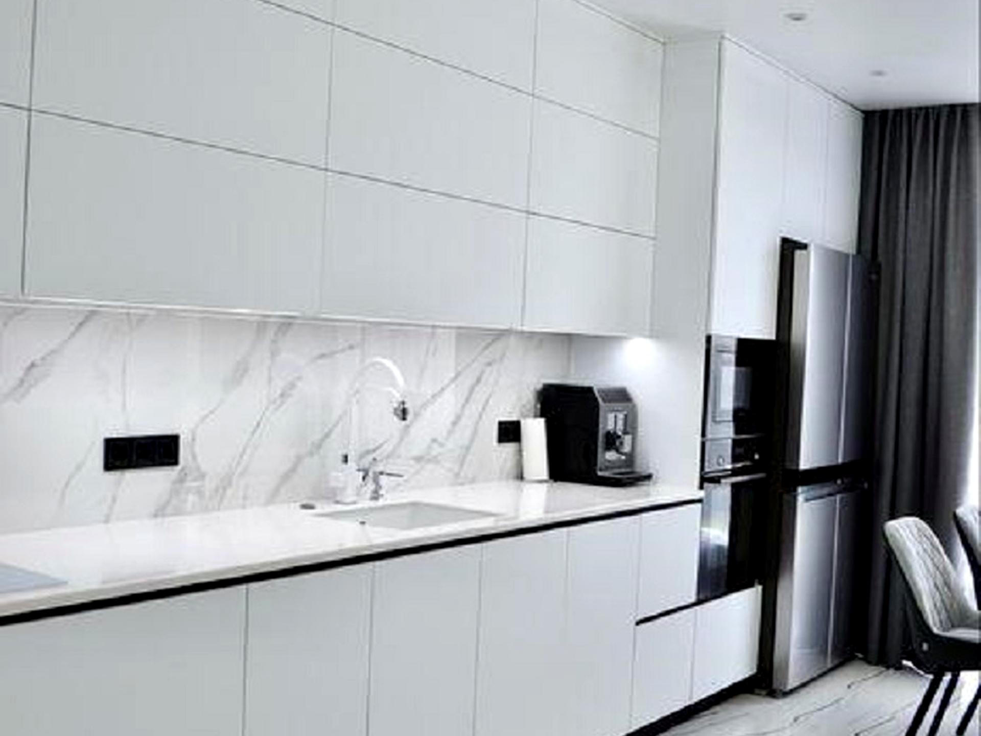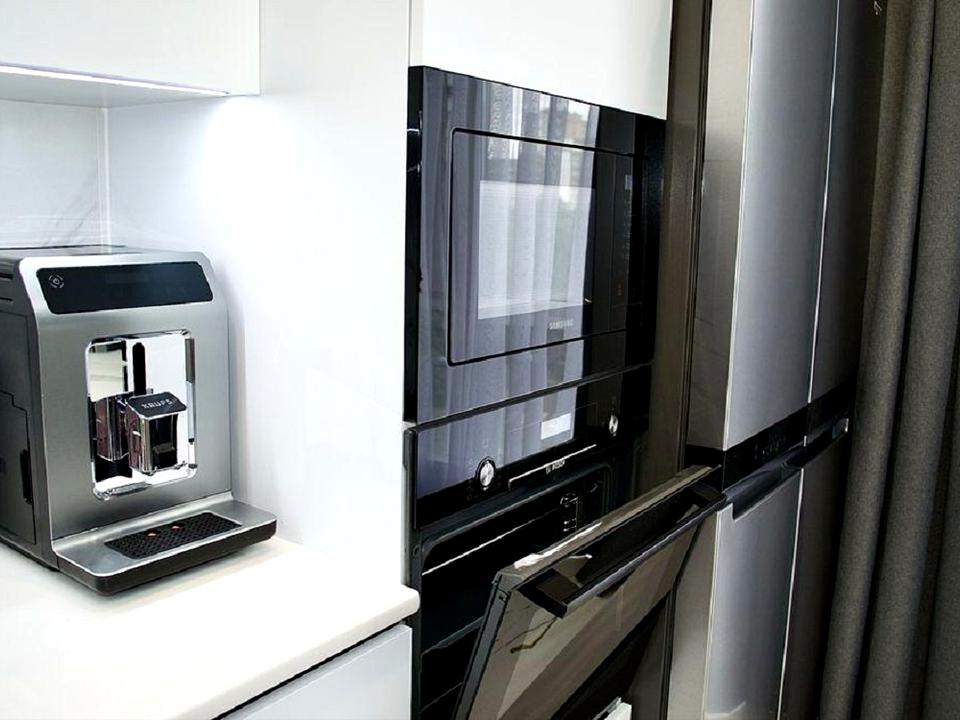 Повна комплектація меблями (зроблені під індивидуальне замовлення) та побутовою техникою, в т.ч. Холодильник Side-by-side, Духова шафа Bosch, Посудомийна машина Siemens, Мікрохвильова піч Samsung, Індукційна плита Bosch, Потужна витяжка Fabiano, Подрібнювач харчових відходів Teca, Система очищення води з мінералізатором, Бойлер Atlantic 100 л., Пральна машина Bosch + Сушильна машина Siemens, Телевізор Samsung.