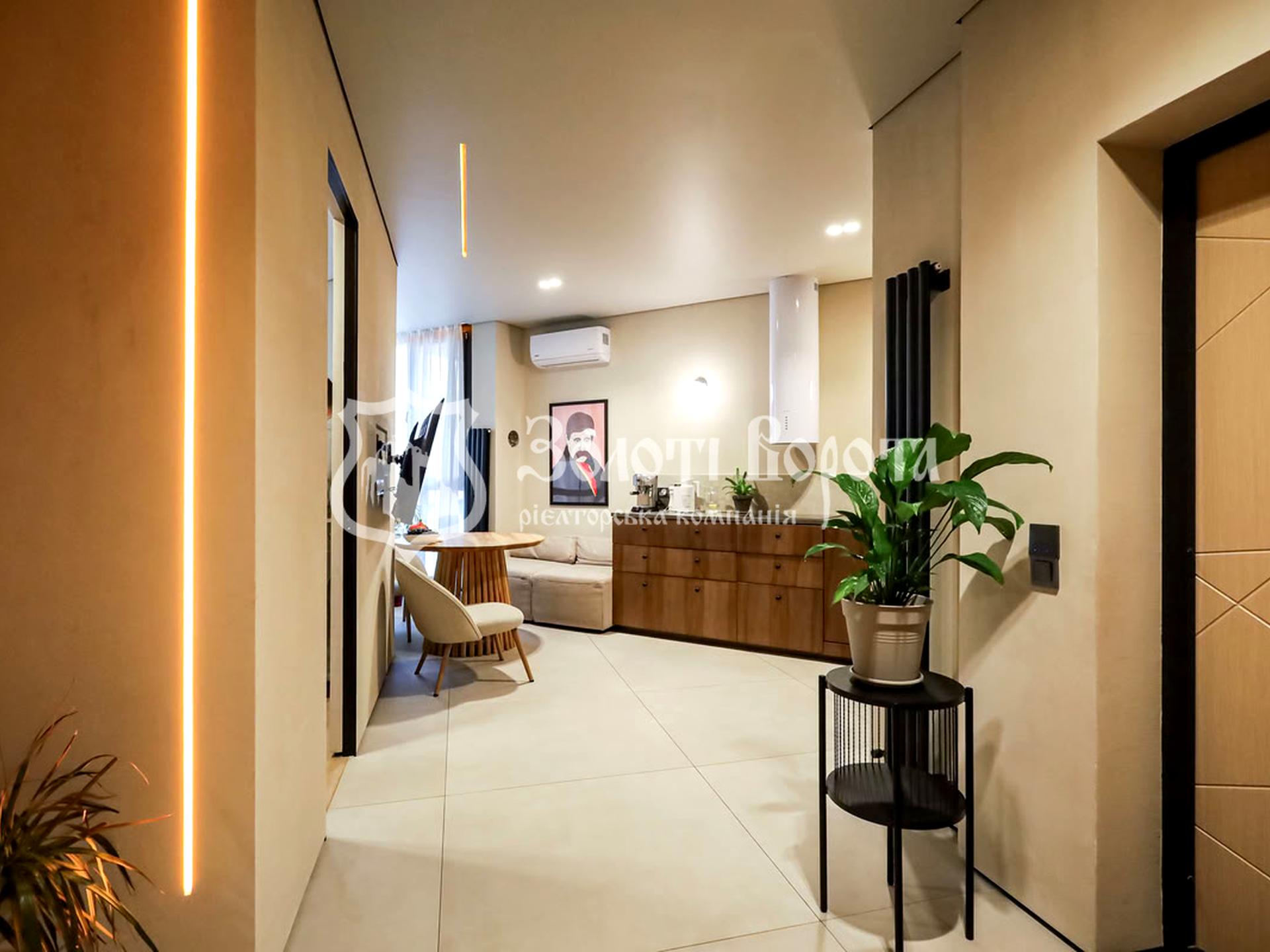 Кухня-вітальня, дві окремі кімнати, два санвузли — усе оформлено з увагою до деталей. Іспанський керамограніт, вінілове покриття quick step, гіпсокартонна стеля з точковими світильниками, приховані плінтуси.