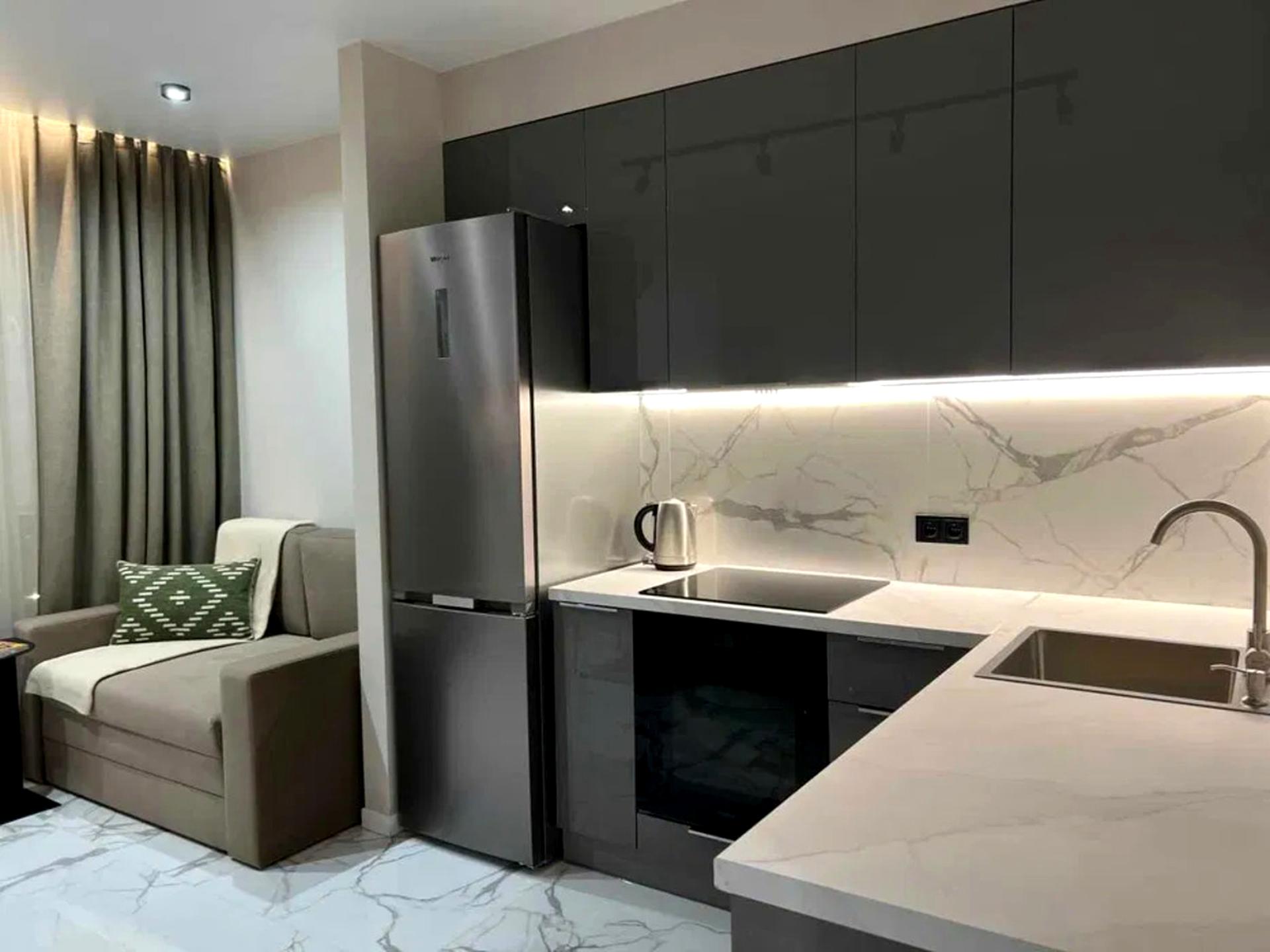 Вбудована техніка, якісне освітлення, мармурові акценти.