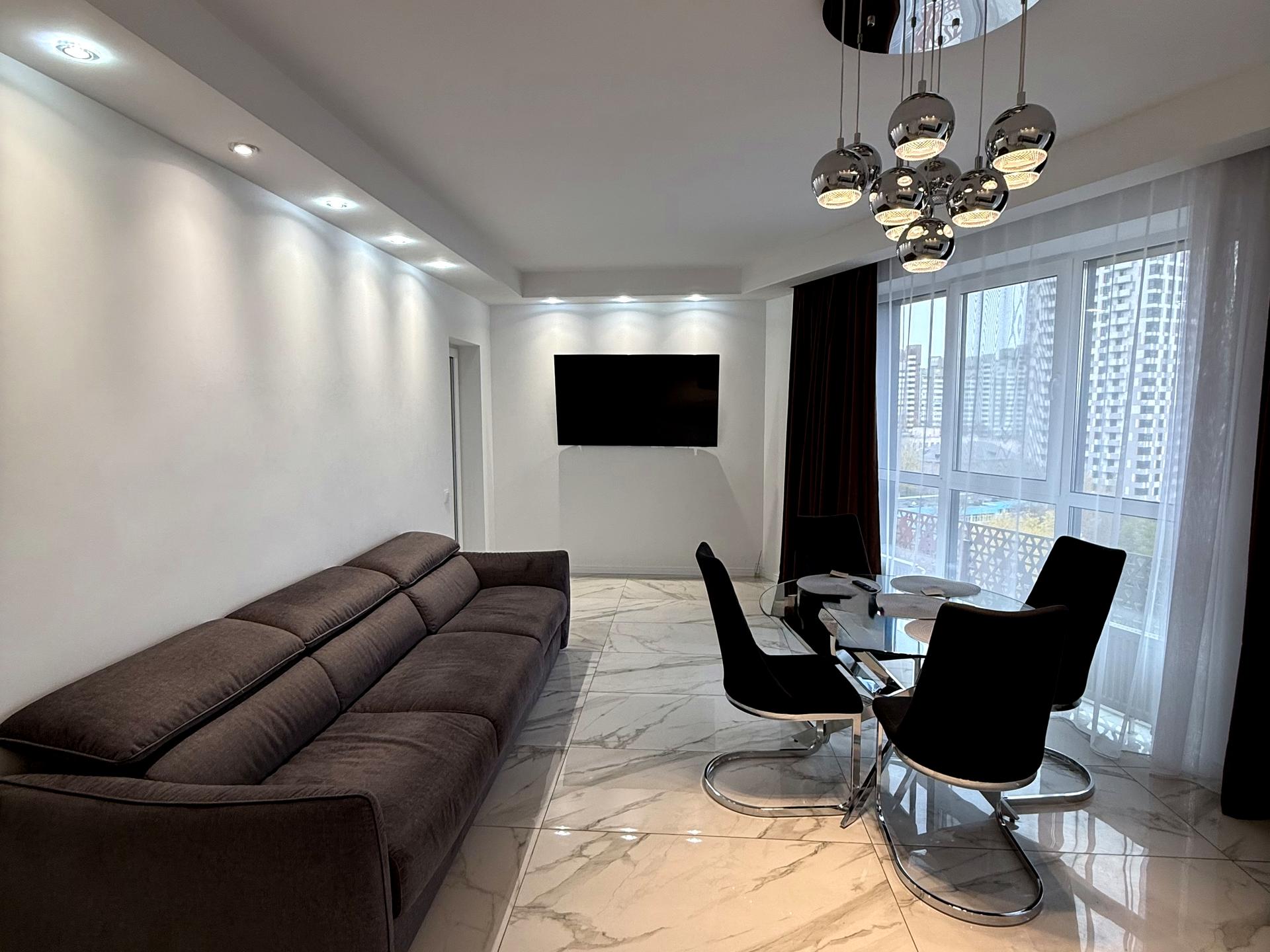 Ремонт виконаний із використанням якісних матеріалів, у сучасному стильному дизайні. Квартира повністю мебльована та укомплектована побутовою технікою: встановлено телевізор, кондиціонер, Wi-Fi, бойлер, кухонні меблі та техніку.