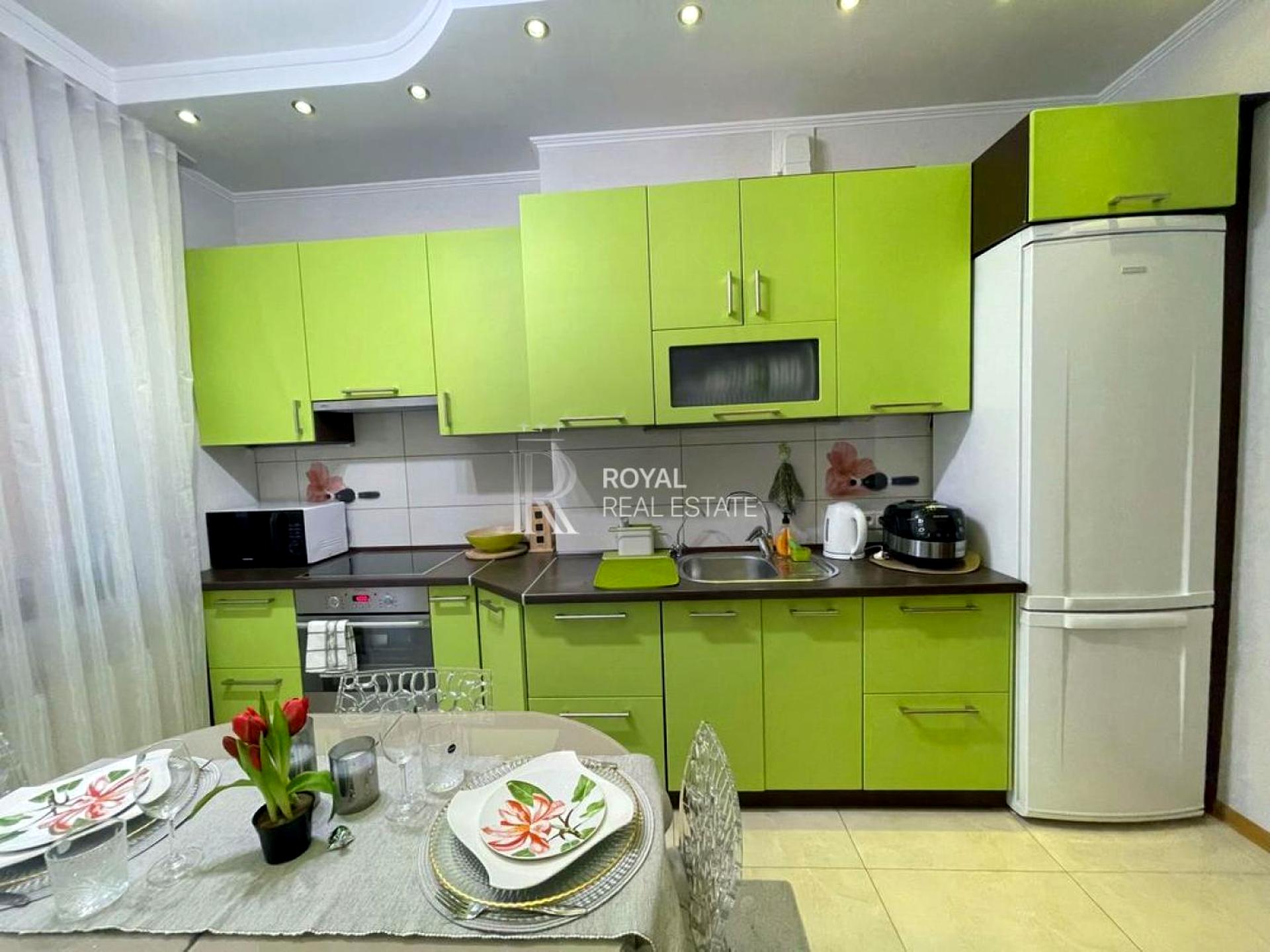 Кухня 11,5 м² з холодильником, мікрохвильовою пічкою, пароваркою, електрочайником та столовим посудом