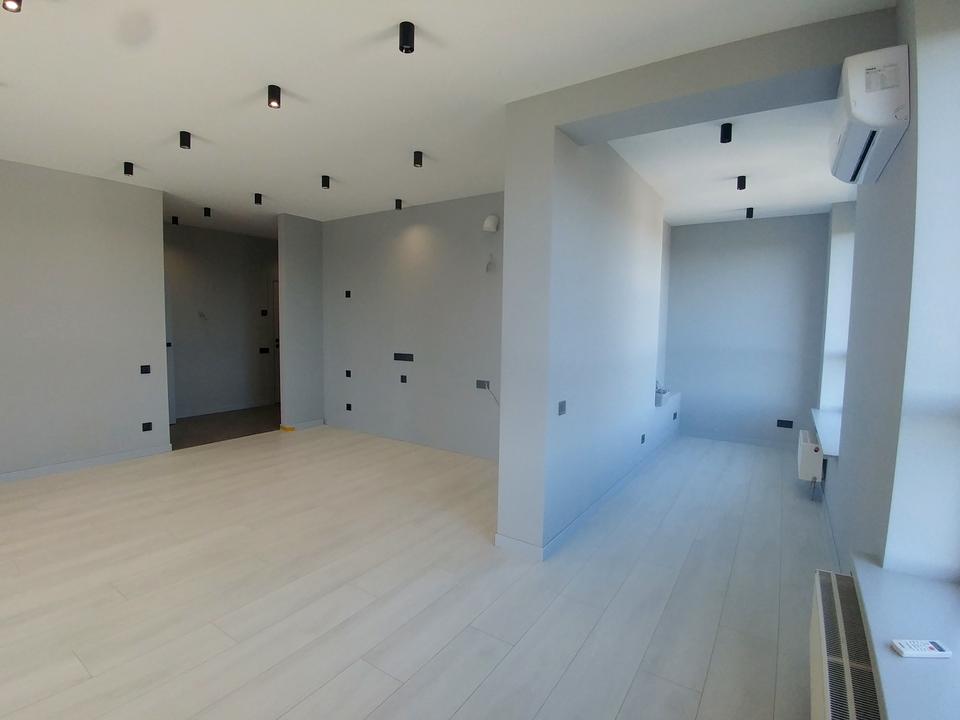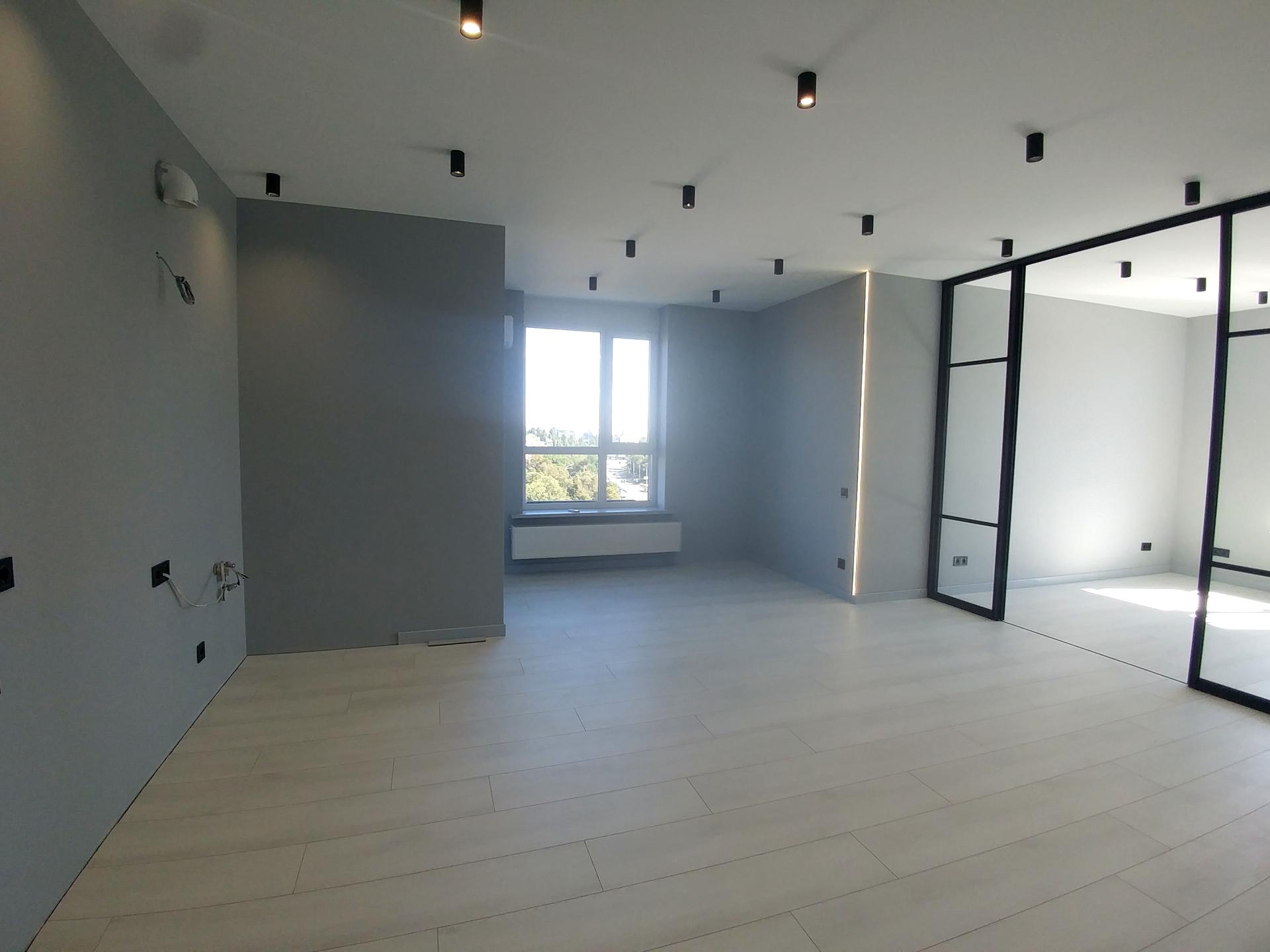 Перепланування по дизайн-проєкту: велика кухня-вітальня, окрема спальня з гардеробною, Стіни пофарбовані стійкою фарбою, підігрів підлоги, освітлення, розетки, бойлер, вся сантехніка, виводи під пральну та сушильну машину, кабінет виділений розсувними скляними дверима, загальна гардеробна, 2 санвузли.