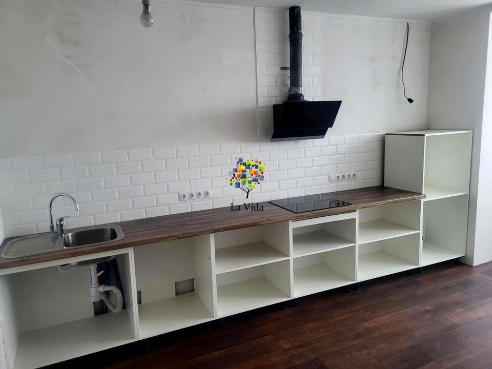 - Кухонна зона підготовлена: встановлена стільниця, мийка, варильна поверхня, витяжка, розведені розетки