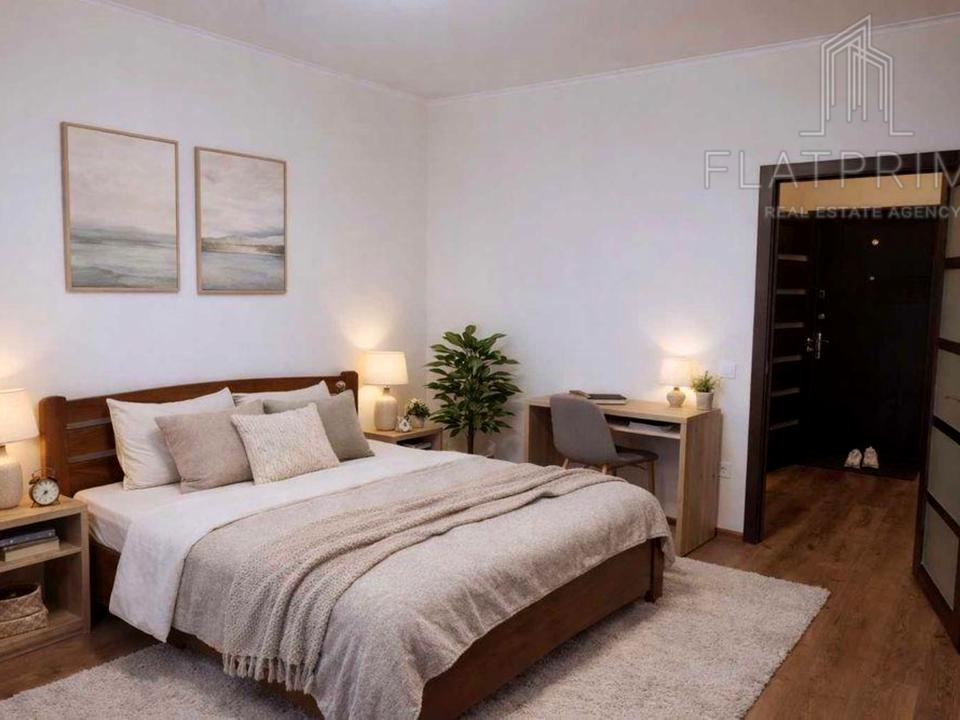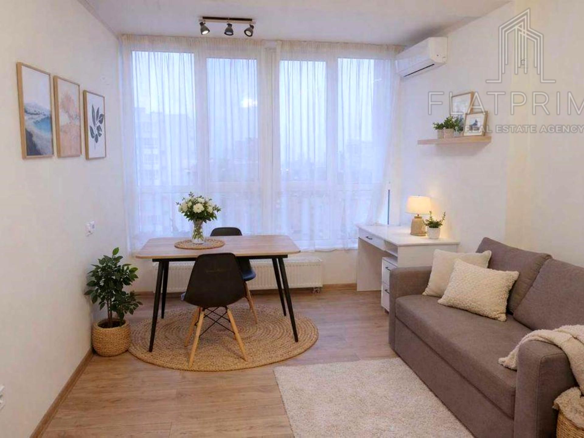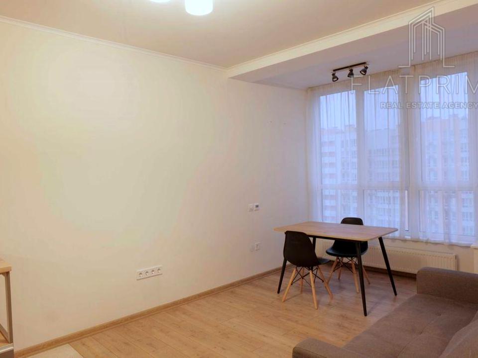 Затишна квартира на 15/17 поверху з видом на місто. Загальна площа 45,32 м², житлова 18,61 м². Лоджія об’єднана з кухнею, утворено простору кухню-вітальню з великим природним освітленням. Квартира з ремонтом від забудовника, готова до проживання. Всі меблі та техніка на фото залишаються: кухня, диван-ліжко, стіл і стільці, вбудована шафа-купе, бойлер, пральна машина, кондиціонер, підігрів підлоги. Опалення централізоване.