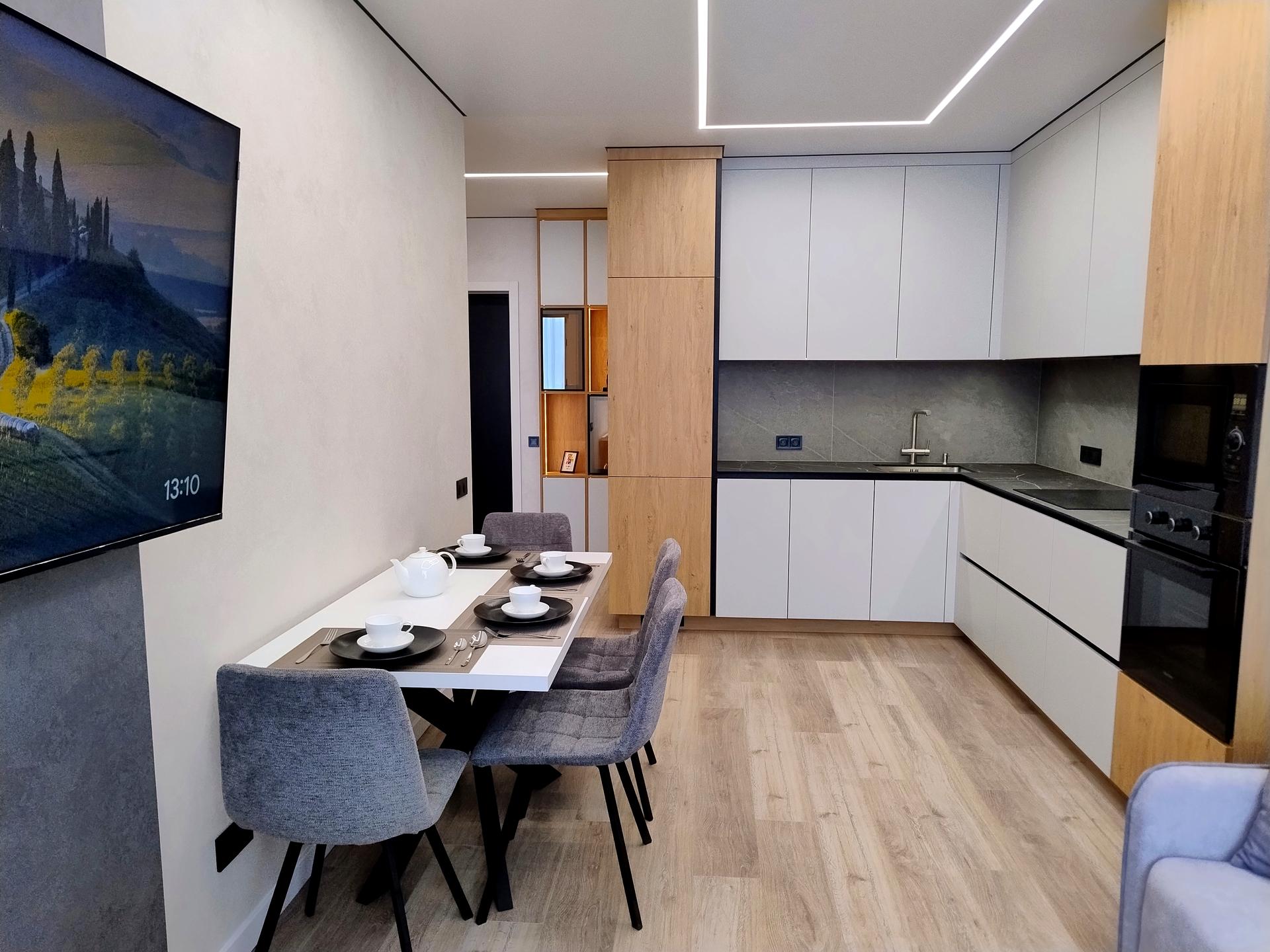 Простора квартира 48 м2, (кухня-вітальня, окрема спальня, коридор санвузол з ванною, Гардеробна). Виконано якісний, ремонт по перевіреному дизайн-проекту в сучасному класичному стилі! Індивідуальні меблі, якісна побутова техніка(пральна машинка, варильна поверхня, мікрохвильовка, духова шафа, холодильник смарт телевізор, кондиціонери), тепла підлога, топове зоноване освітлення