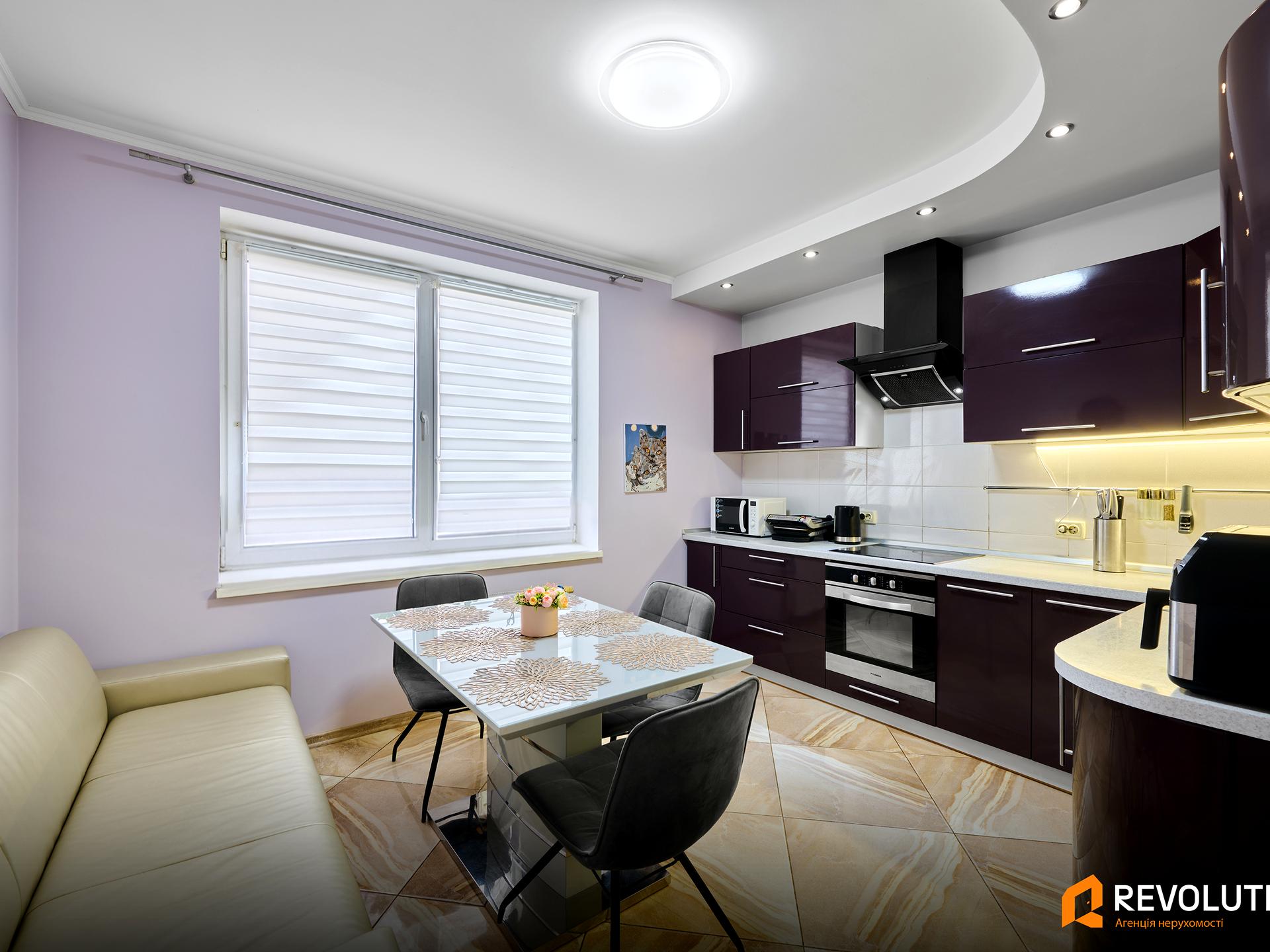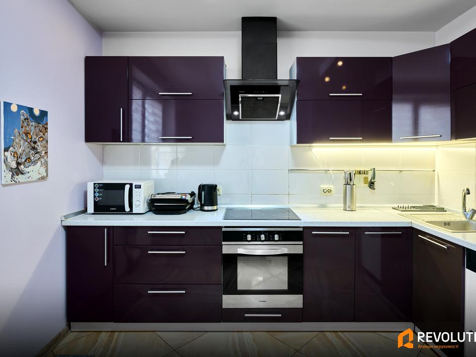 Кухня укомплектована: посудомийна машина, плита, духова шафа, холодильник, мікрохвильова піч.
