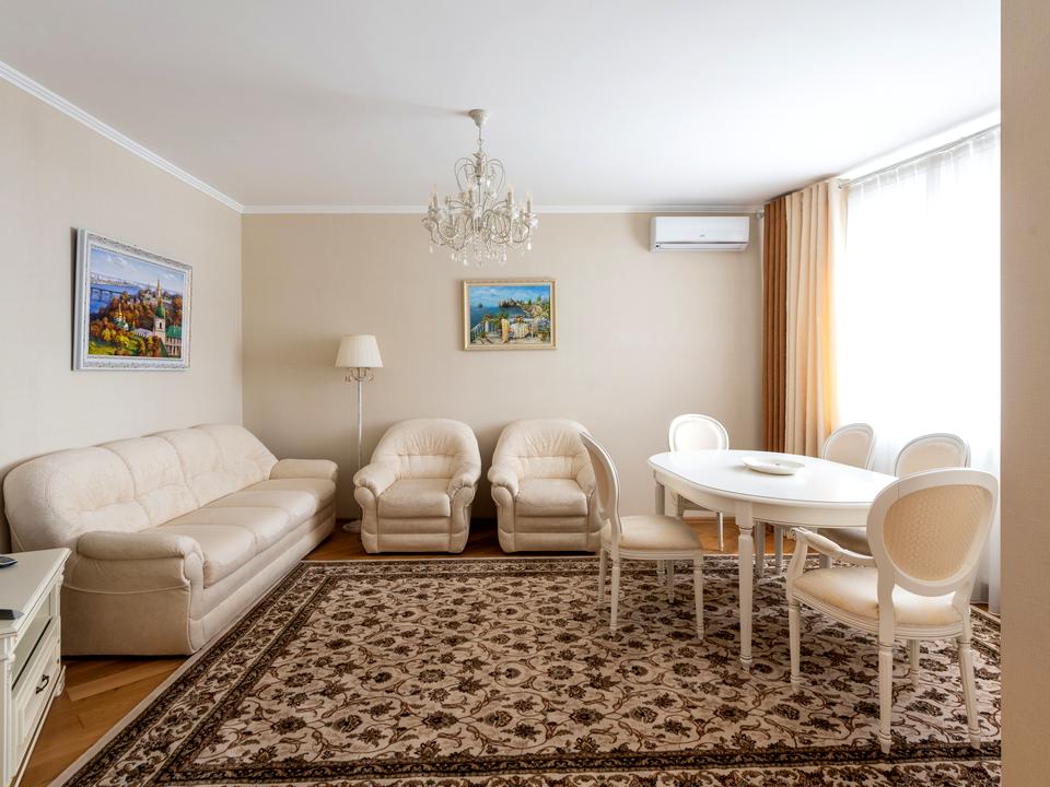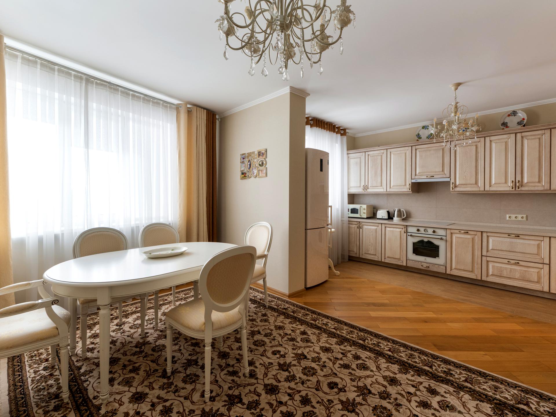 Квартира повністю **мебльована та укомплектована технікою** — усе продумано до деталей. Простора кухня, затишна вітальня, світлі кімнати та окрема **гардеробна кімната** забезпечують зручність у повсякденному житті.