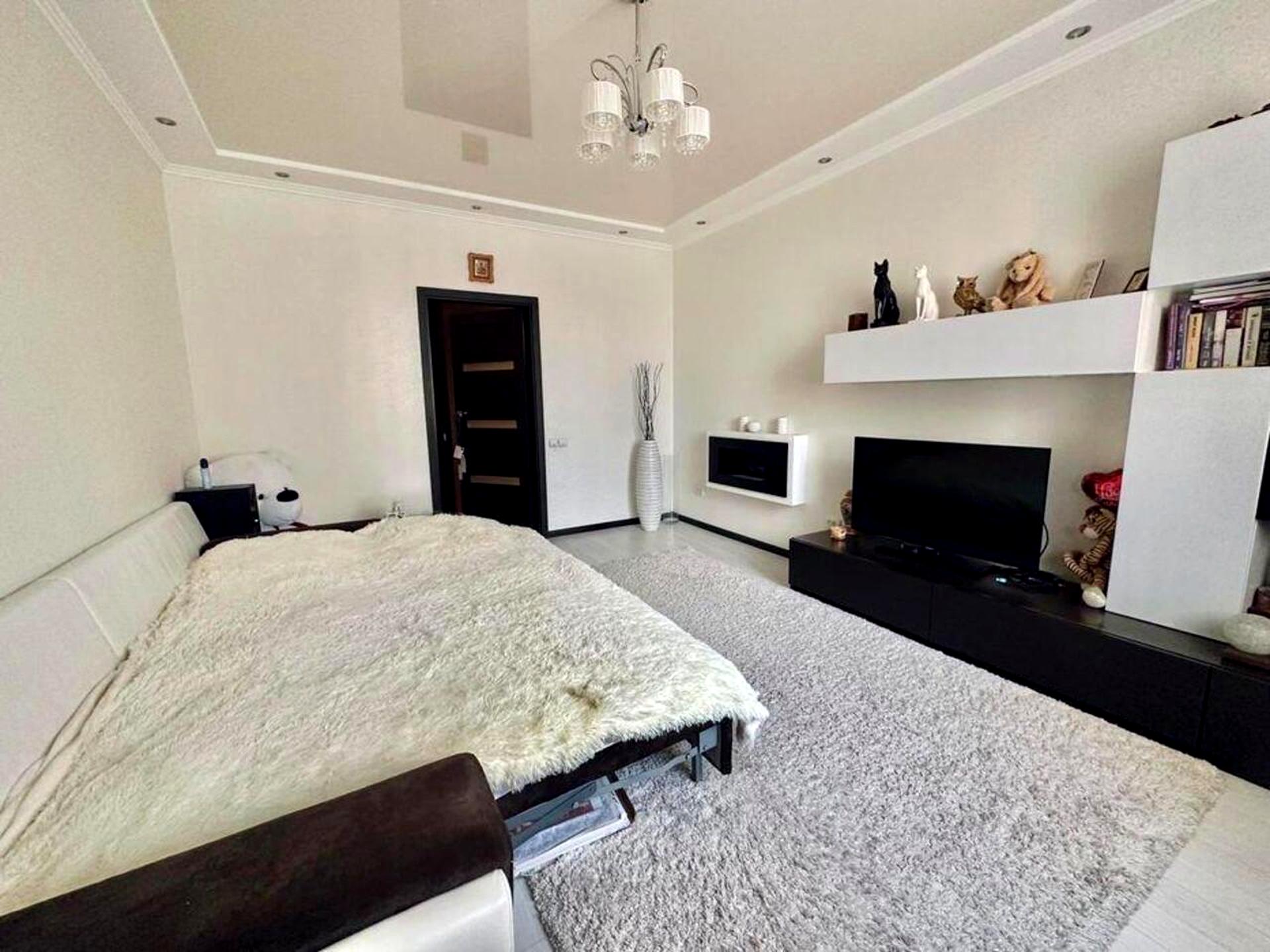 Простора, в світлих тонах, з багаторівневою стелею та точковим освітленням. Великий м’який диван, ТВ-зона з підвісною тумбою та декоративним електрокаміном створюють атмосферу затишку. Інтер’єр сучасний, мінімалістичний і доглянутий — можна заїжджати без додаткових вкладень.