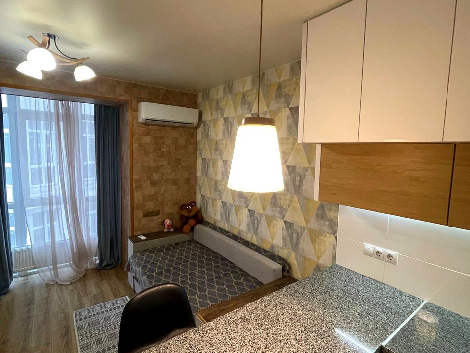 В квартирі 1 кімната, висота стелі 2.7 метра, Технологія будівництва - Цегляна, Тип будинку - Спец. проект. Немає газу, кухонна плита електрична. Будинок побудований в 2017 році. Загальний стан квартири - З ремонтом. Кількість санвузлів: 1. Тип кухні - кухня-студія. Кількість спален: 1. Без комісії