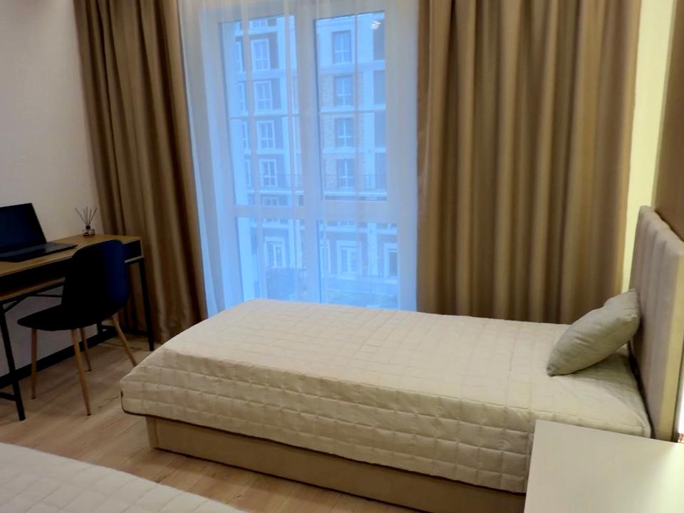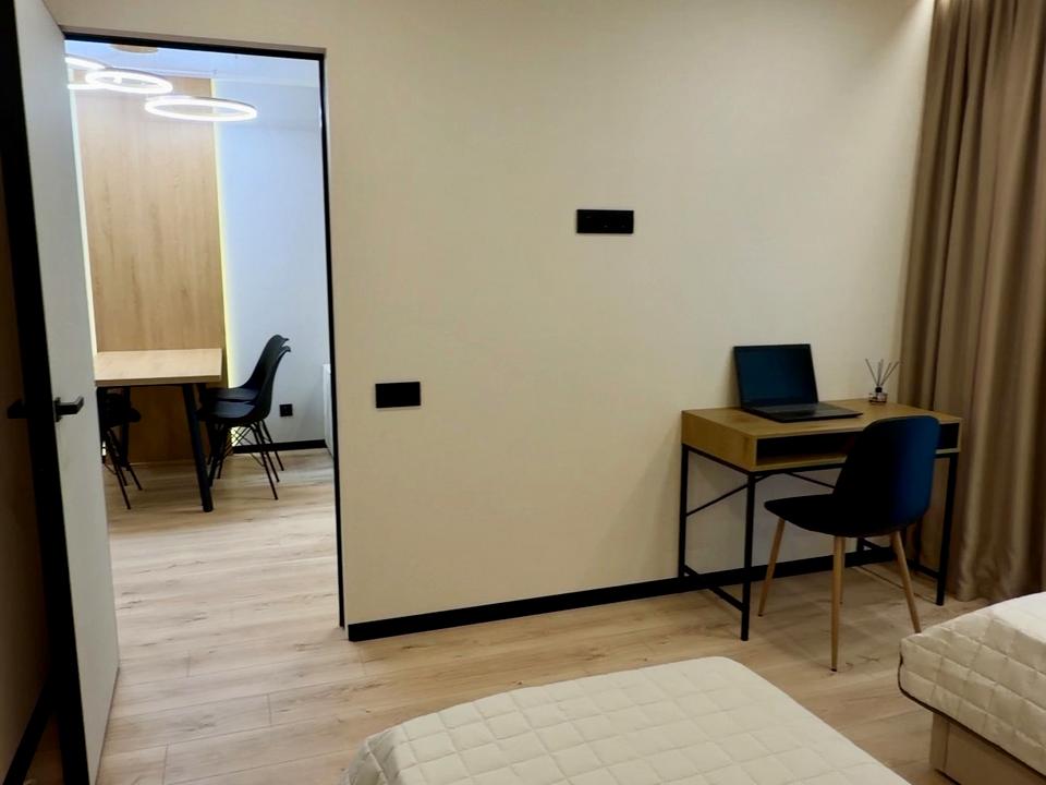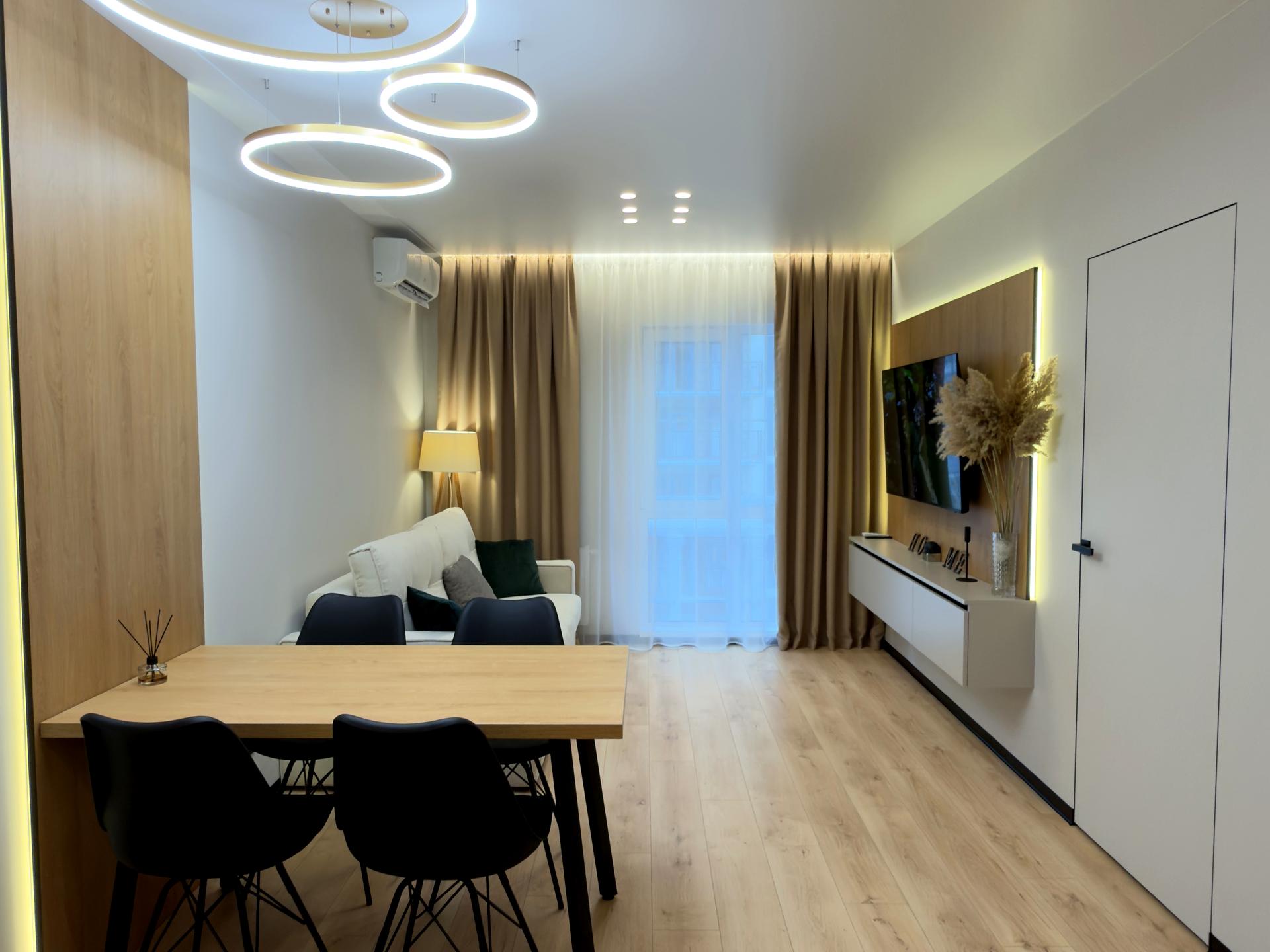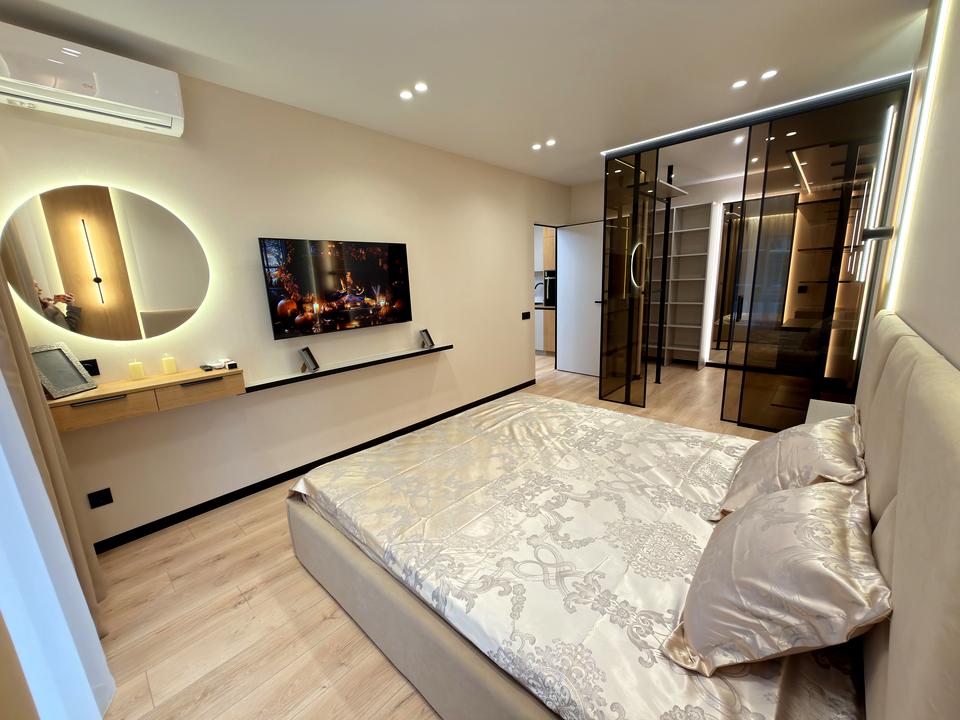 В квартирі 2 кімнати, висота стелі 3 метра, Технологія будівництва - Монолітно-каркасна, Тип будинку - Спец. проект. Немає газу, кухонна плита електрична. Немає балкона. У квартирі є Телевізор, Кондиціонер, Пральна машина, Ванна, Холодильник, Мікрохвильовка, Посудомийна машина. Будинок побудований в 2024 році. Загальний стан квартири - З ремонтом. Безбар'єрність: дверні отвори в будинку шириною понад 0.9 м. Гаряча вода - електричний бойлер. Кількість санвузлів: 2. Інтернет бездротовий. Працює без світла - вода, опалення, інтернет, ліфт. Тип кухні - кухня-студія. Кількість спален: 2. Комісія за послуги 3 %