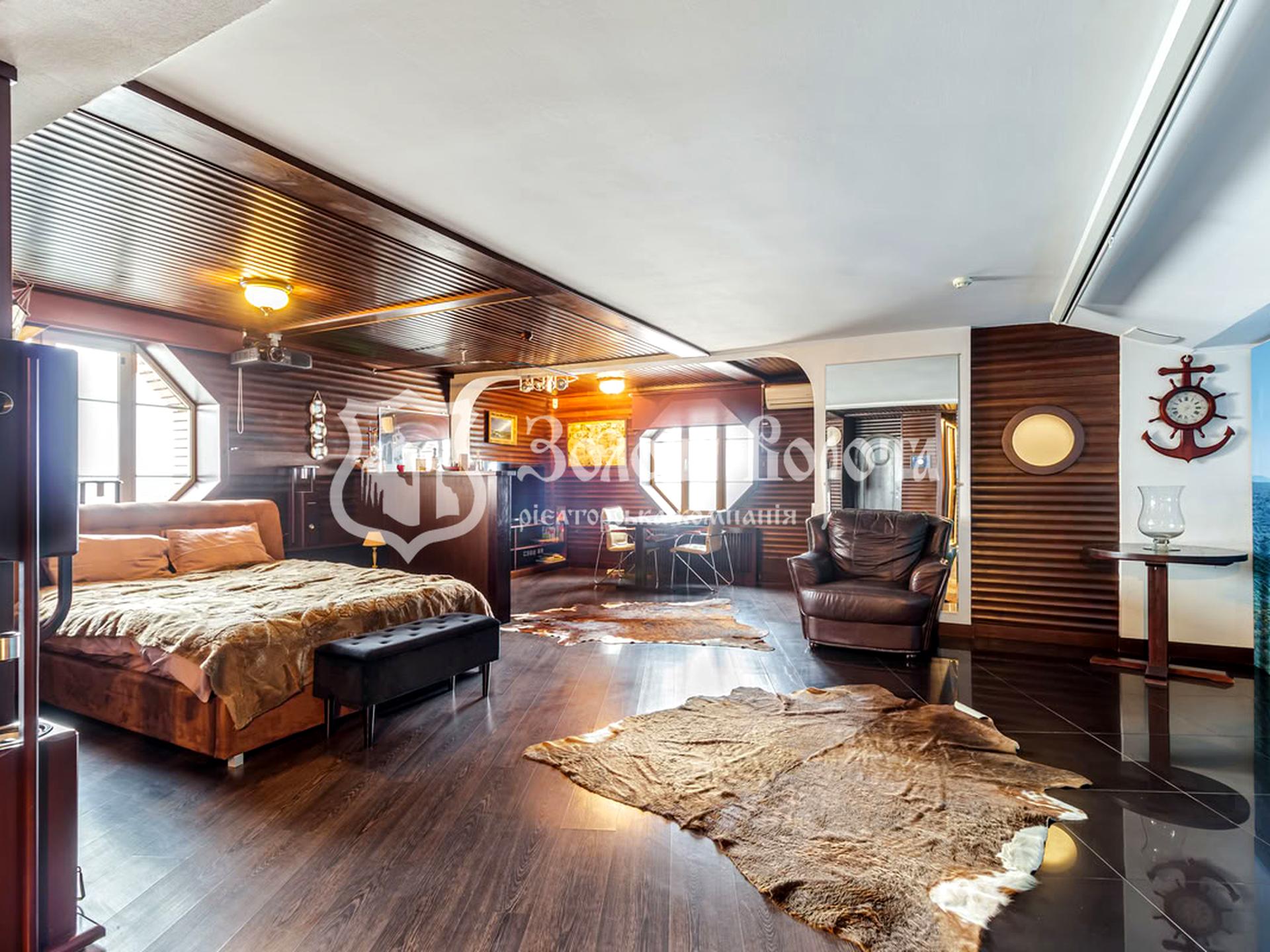 Стіни та стеля повністю обшиті натуральним ясенем, що є витонченою ручною роботою. Ви будете насолоджуватися величезним панорамним видом на Київ, який стає особливо магічним увечері.