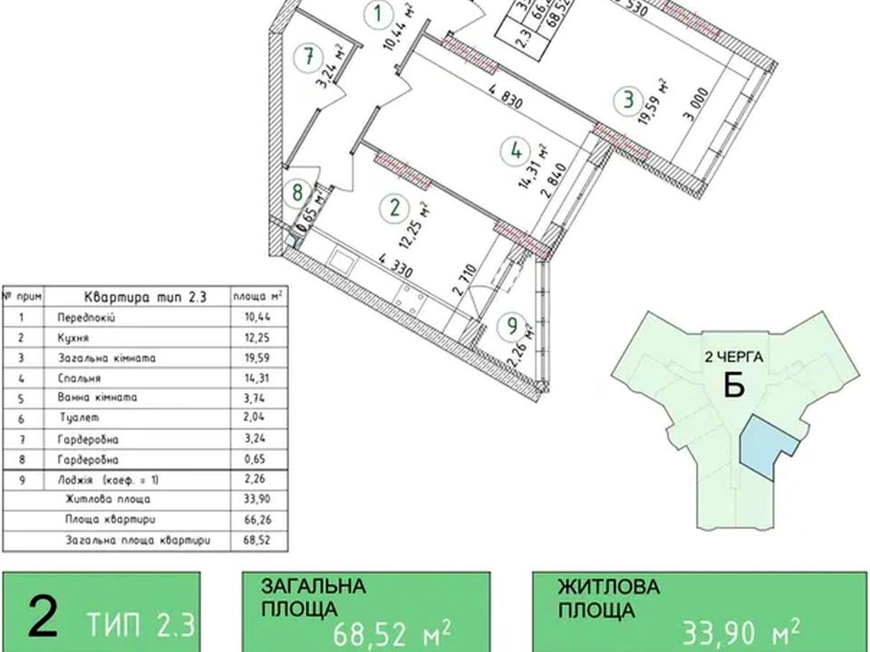 В квартирі 2 кімнати, висота стелі 2.5 метра, Технологія будівництва - Цегляна, Тип будинку - Спец. проект. Немає газу. Є балкон. Будинок побудований в 2025 році. Загальний стан квартири - Без ремонту. Кількість санвузлів: 2. Тип кухні - кухня-студія. Кількість спален: 2. Інфраструктура території: дитячий майданчик, спортивний майданчик. Комісія за послуги 3 %