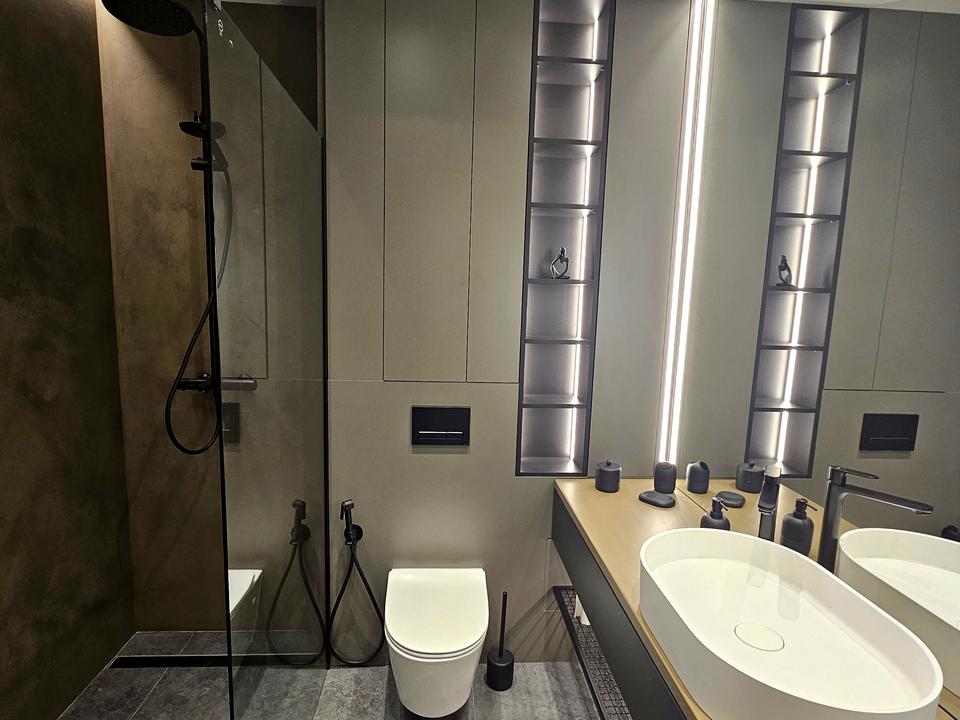 Сучасний великий санвузол має душову кабіну і також багато простору.