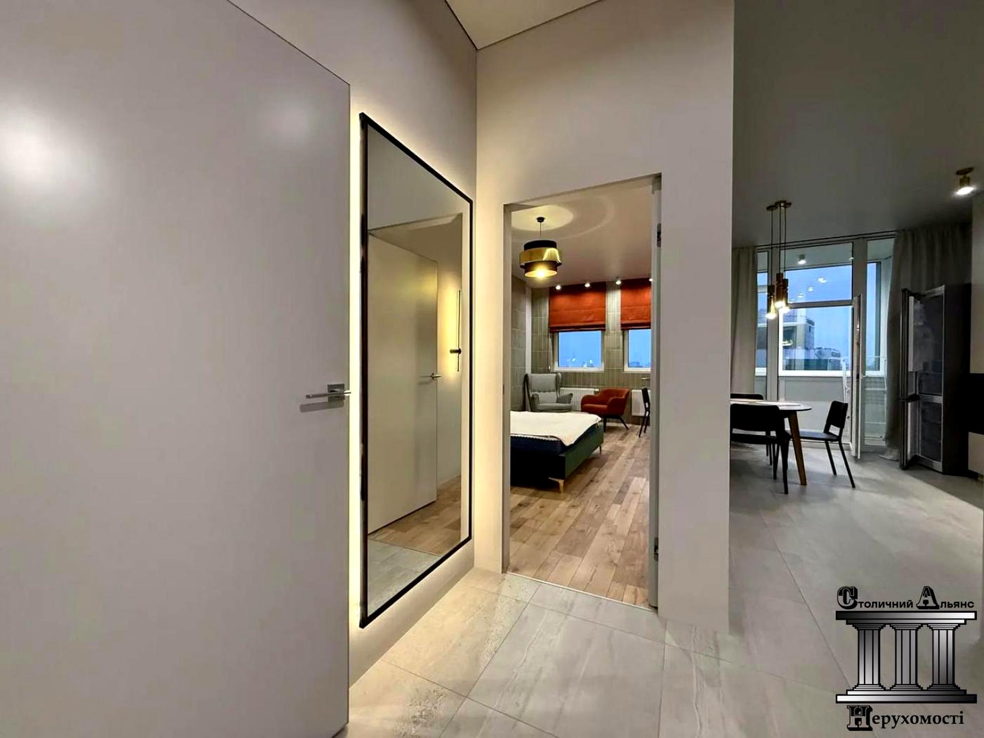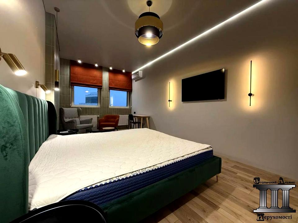 Планування: спальня з шафами, зоною відпочинку, кондиціонером та телевізором; окрема гардеробна кімната; вбудована кухня: холодильник, посудомийна машина, духова шафа, варильна поверхня; засклений балкон; суміжна ванна кімната: душова кабіна, туалет, бойлер на 80 л, пральна машина, електрична сушарка для білизни. Оптоволоконний інтернет. Тепла підлога. Зроблена шумоізоляція стін.