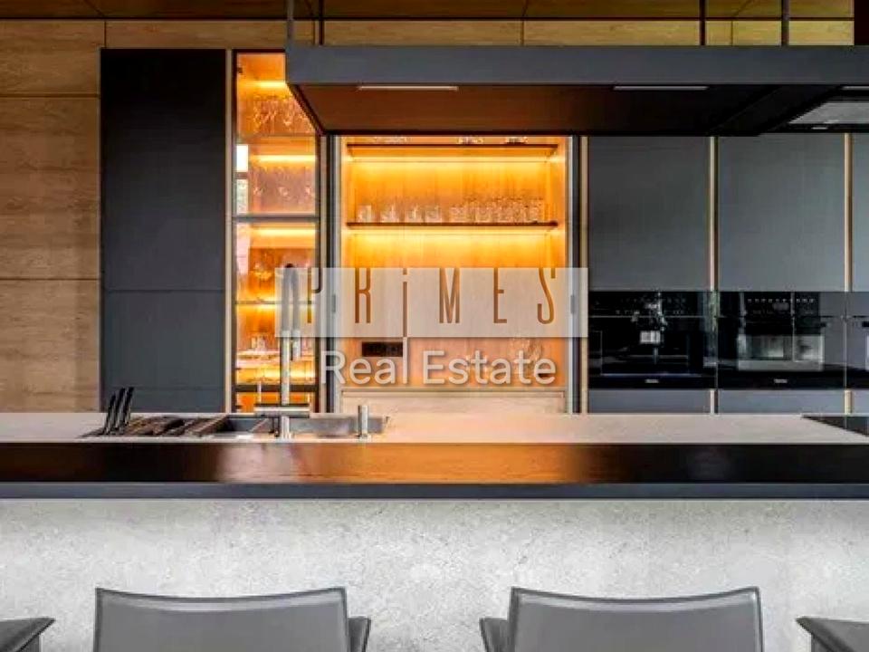 Это двухэтажное творение искусства, общей площадью 390 кв. Дом с двумя террасами, с камином и дизайн интерьера в современном стиле, только из натуральных материалов. Панорамные окна и множество смелых решений в интерьере. Кухня с гигантским островом из керамогранита подрезанным под углом 45 градусов. Мебель с защитным покрытием отпечатков пальцев. Техника Miele, только посудомоечная машина Bosch.