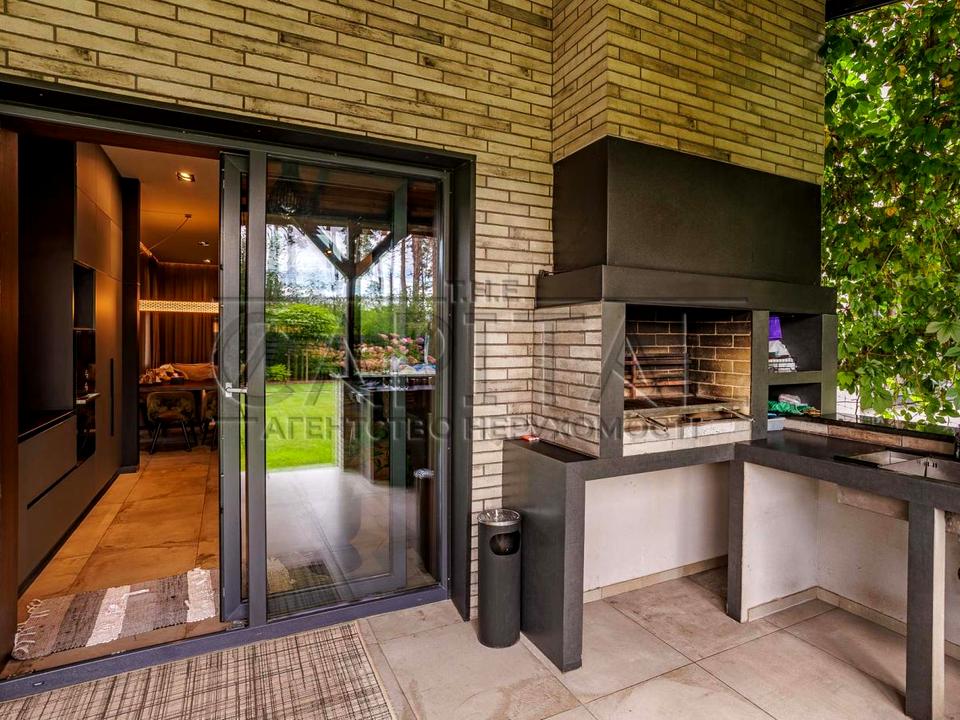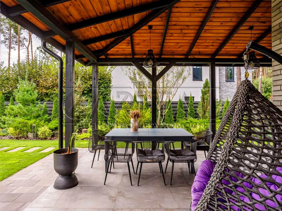 На території є відкрита тераса з мангалом та літньою кухнею. У теплу пору року готувати та влаштовувати зустрічі з друзями, милуючись садом і басейном, — одне задоволення! Після вечері на терасі можна легко переміститися до зони відпочинку з вогнищем, де приємно провести кінець вечора під потріскування полум’я, загорнувшись у пледи.