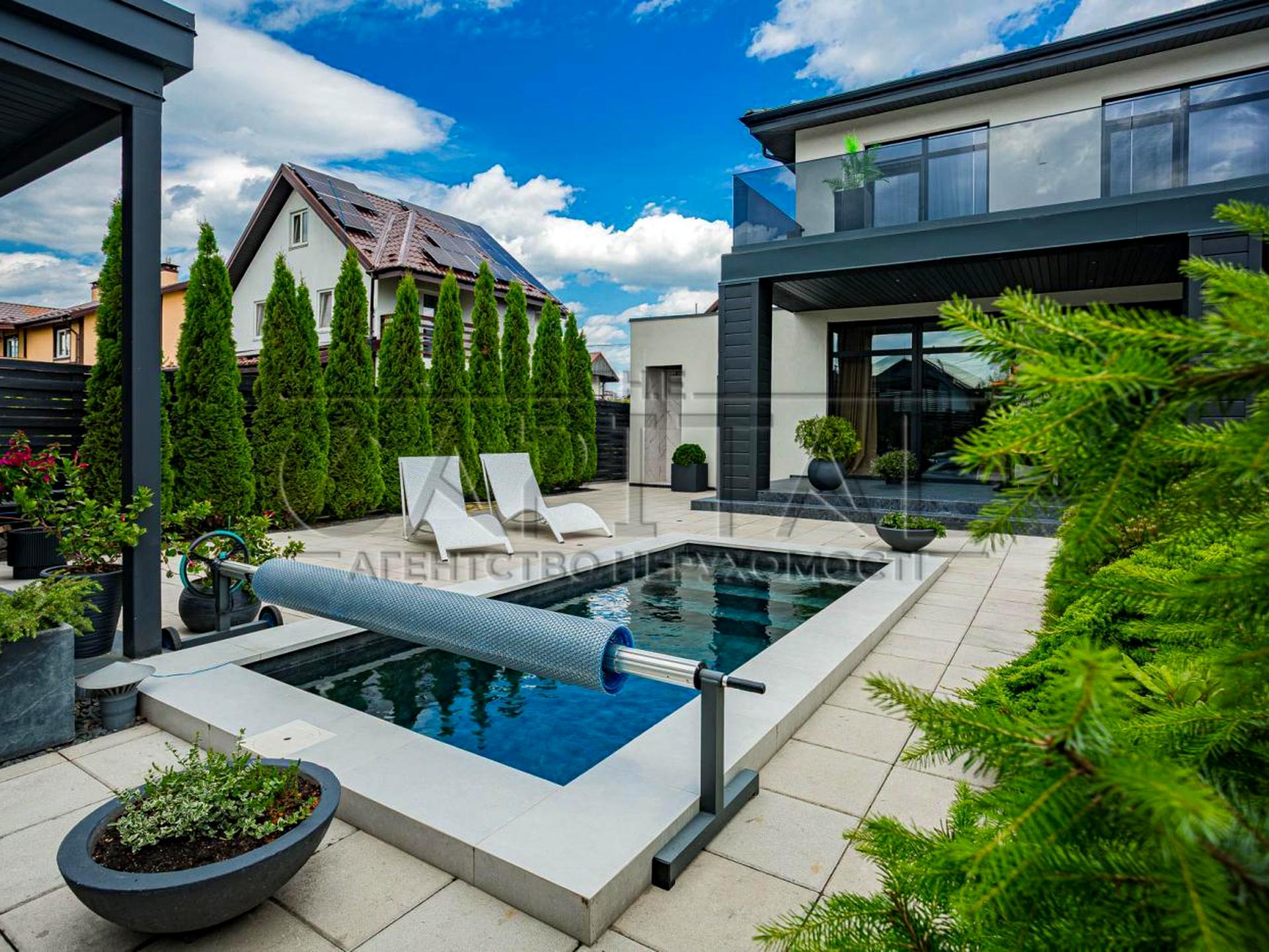 Загальна площа будинку становить 165 м2, площа ділянки - 9 соток. Він вирізняється гарним дизайнерським ремонтом і просторими терасами, басейном та багатим ландшафтом.