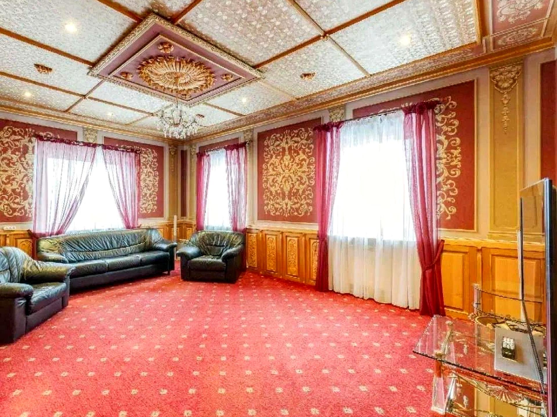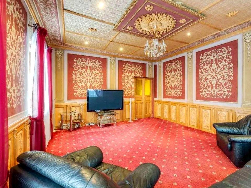 Простора вітальня з мармуровим каміном і авторським розписом.