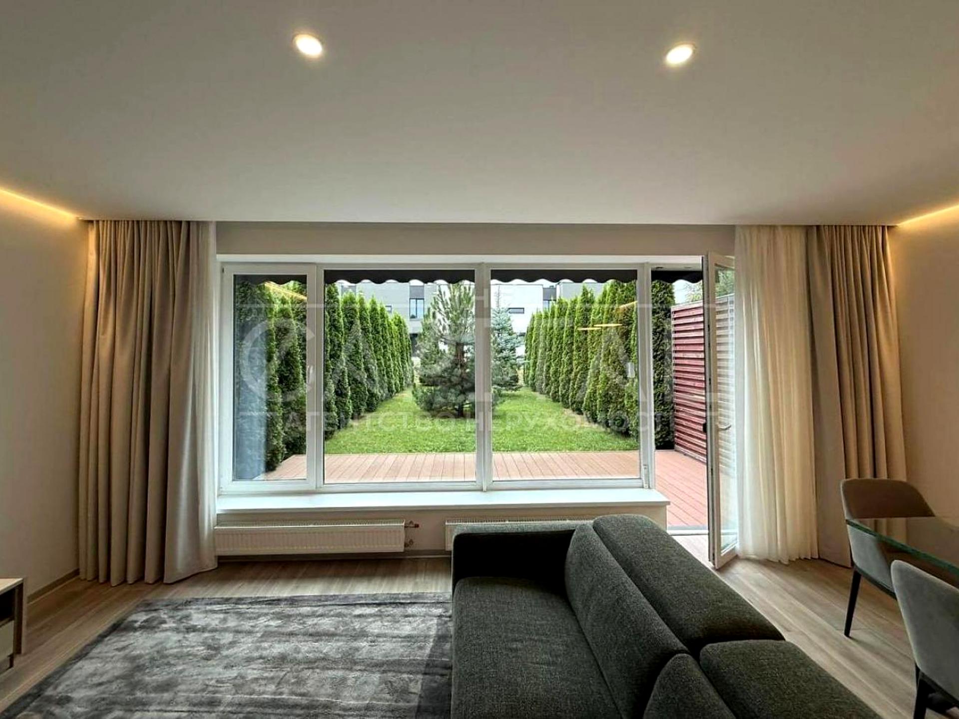 На ділянці розміщений рулонний газон, є літні меблі, дитячий майданчик.