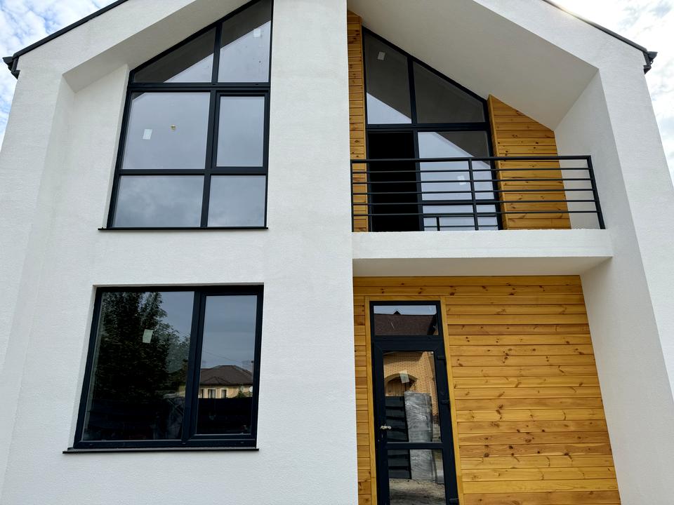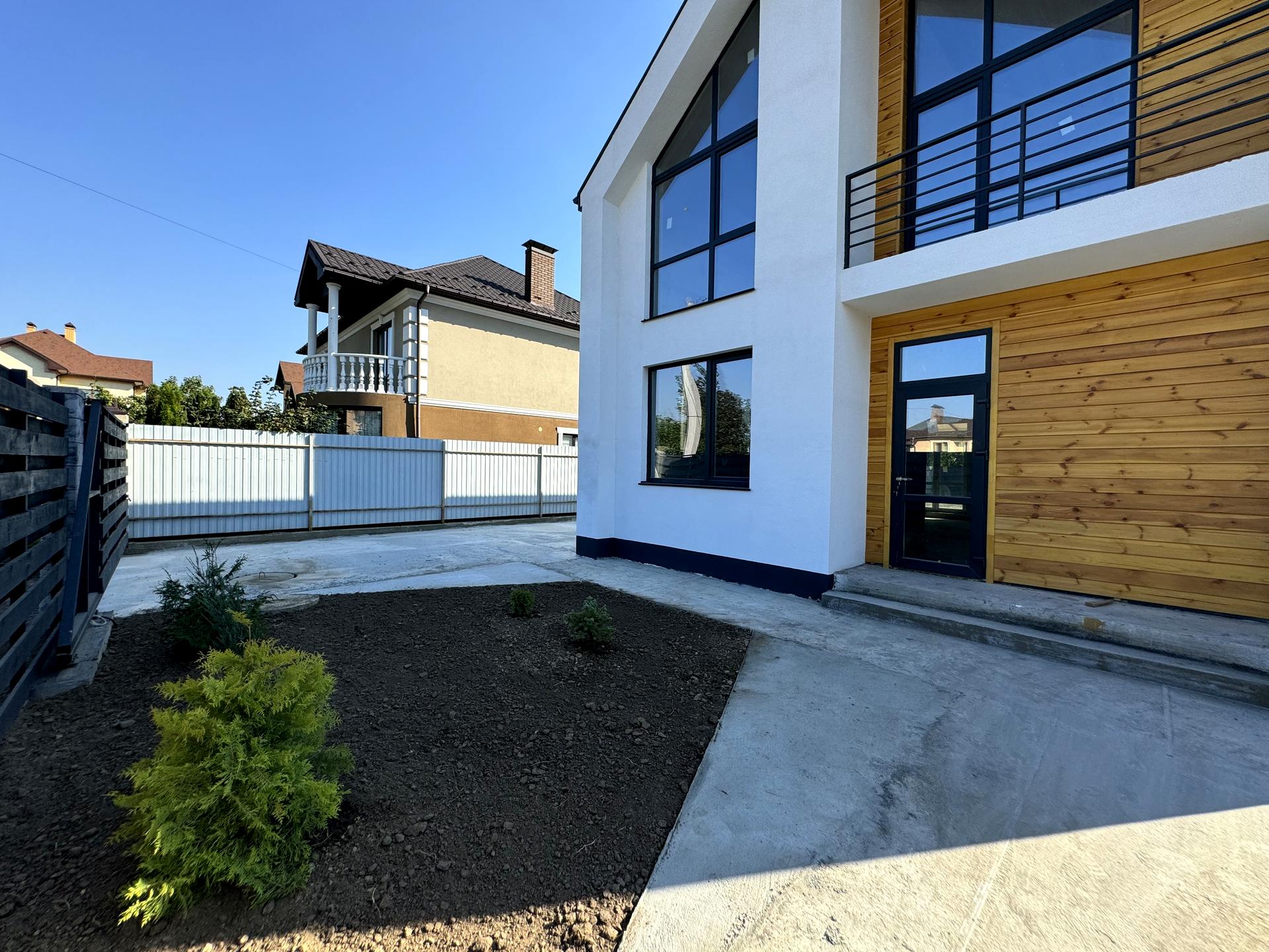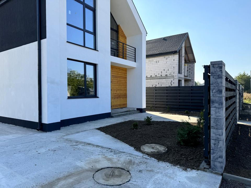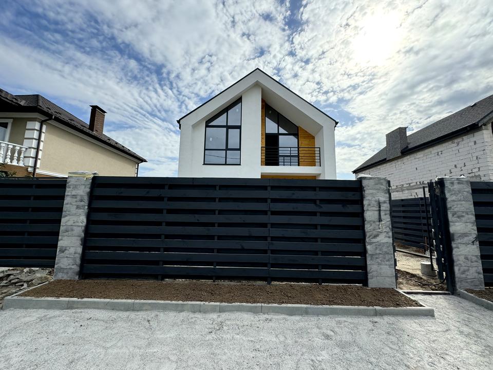 На ділянці 6 соток, правильної форми, по периметру встановлений деревʼяний паркан. Загальна площа 140 м2. Цікавий проєкт, з хорошим плануванням. Чотири окремі кімнати, два санвузли, кухня-вітальня з виходом на терасу.