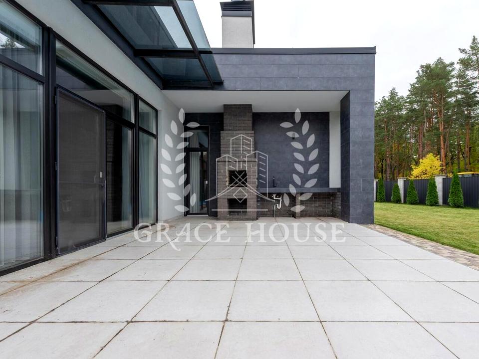 Предлагаем арендовать новый дом в стиле Hi-Tech с выходом в лес в в п.Горенка, граница с Пущей Водицей. Дом одноэтажный, общей площадью 190м. кв. Планировочное решение включает в себя 3 спальни, 3 с/у, кухню — гостиную с камином, сауну, гардеробную, террасу.