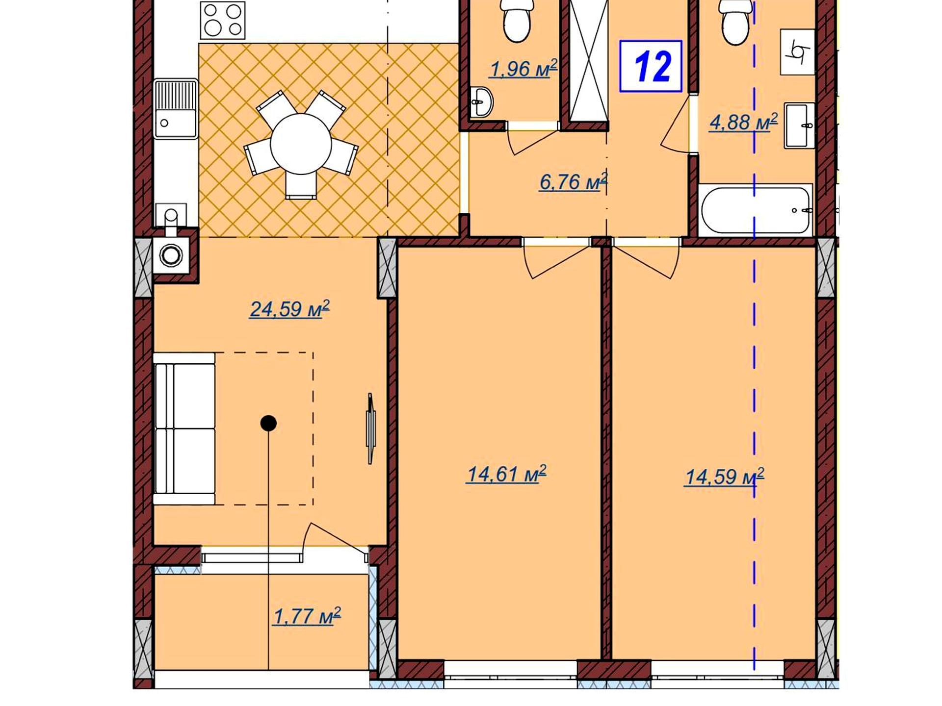 Загальна площа - 68,9 м2, кухня - 25 м2.