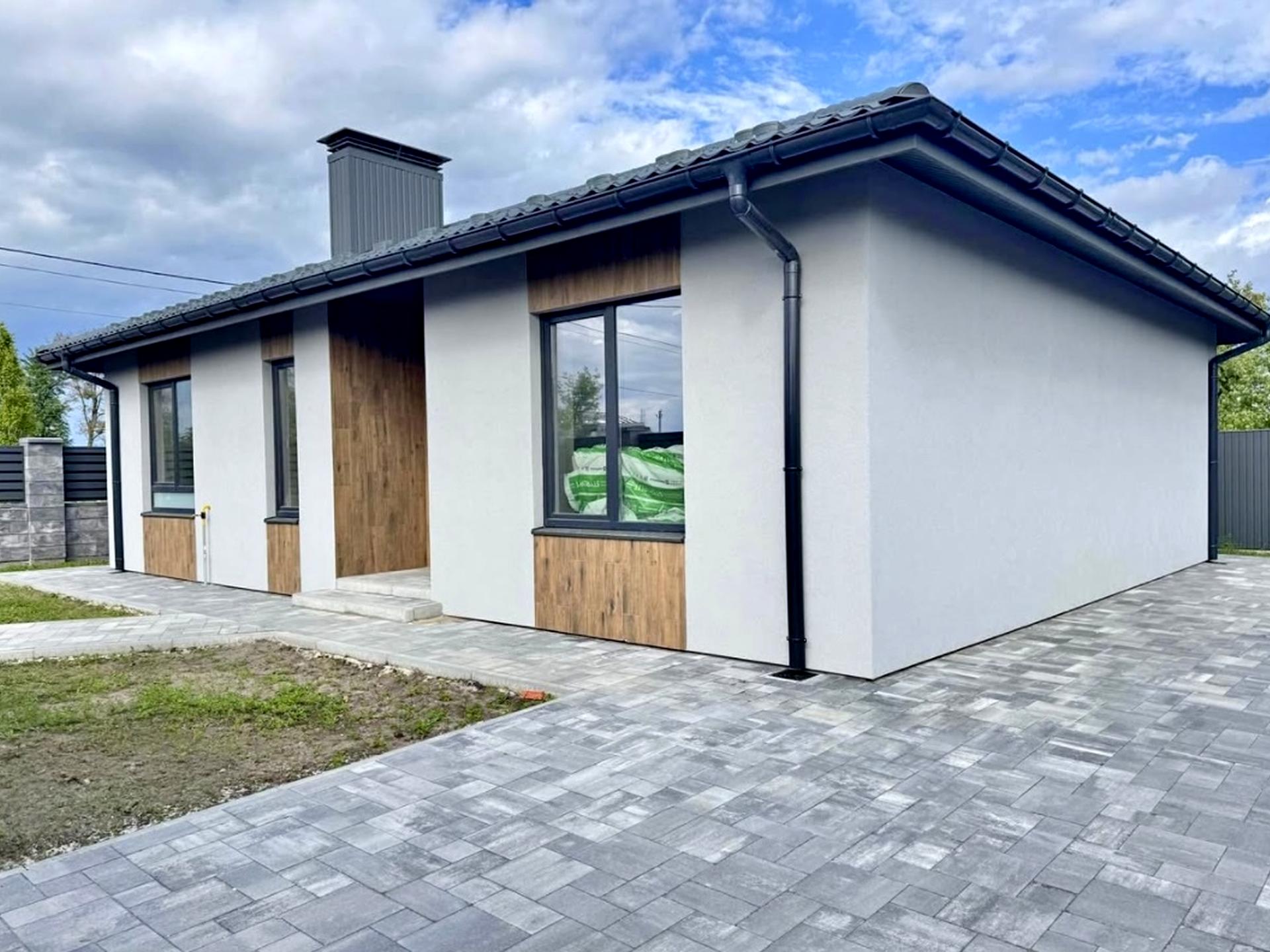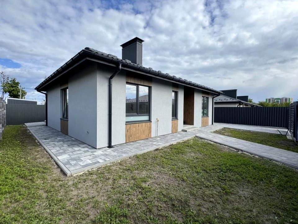 Будинок, 1 поверх, 4 кімнати. Матеріал стін - цегляний, фундамент будинку - залізобетон, матеріал перекриттів - дерево. Під'їзд до будинку - асфальт. Площа ділянки 4 сотки. Висота стелі 2.9 метра. Вид з вікон у двір. Планування кімнат Роздільне. Газ природний. Холодна вода - водопровід, гаряча вода - газовий котел. Опалення котел газовий. У будинку 2 спільних санвузла, туалет/ванна/душ. Сантехніки немає. Розводки труб немає. Вхідні двері броньовані, немає сходів. Покриття підлоги - стяжка. В будинку немає балконів. Тип кухні - кухня-їдальня. Вікна металопластикові, потребують ремонту. Покриття даху - металочерепиця. Є огорожа. Немає підвалу. У будинку є . Будинок побудований в 2025 році. Централізована каналізація. Загальний стан будинку - Без ремонту. Поруч є школа, дитсадок, зупинки, розважальні заклади, річка / озеро, ліс. Можливе розтермінування. Інтернет оптоволоконний. Зовнішнє утеплення стін. Працює без світла - вода, газ, інтернет. Без комісії