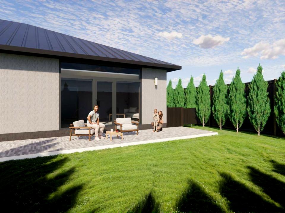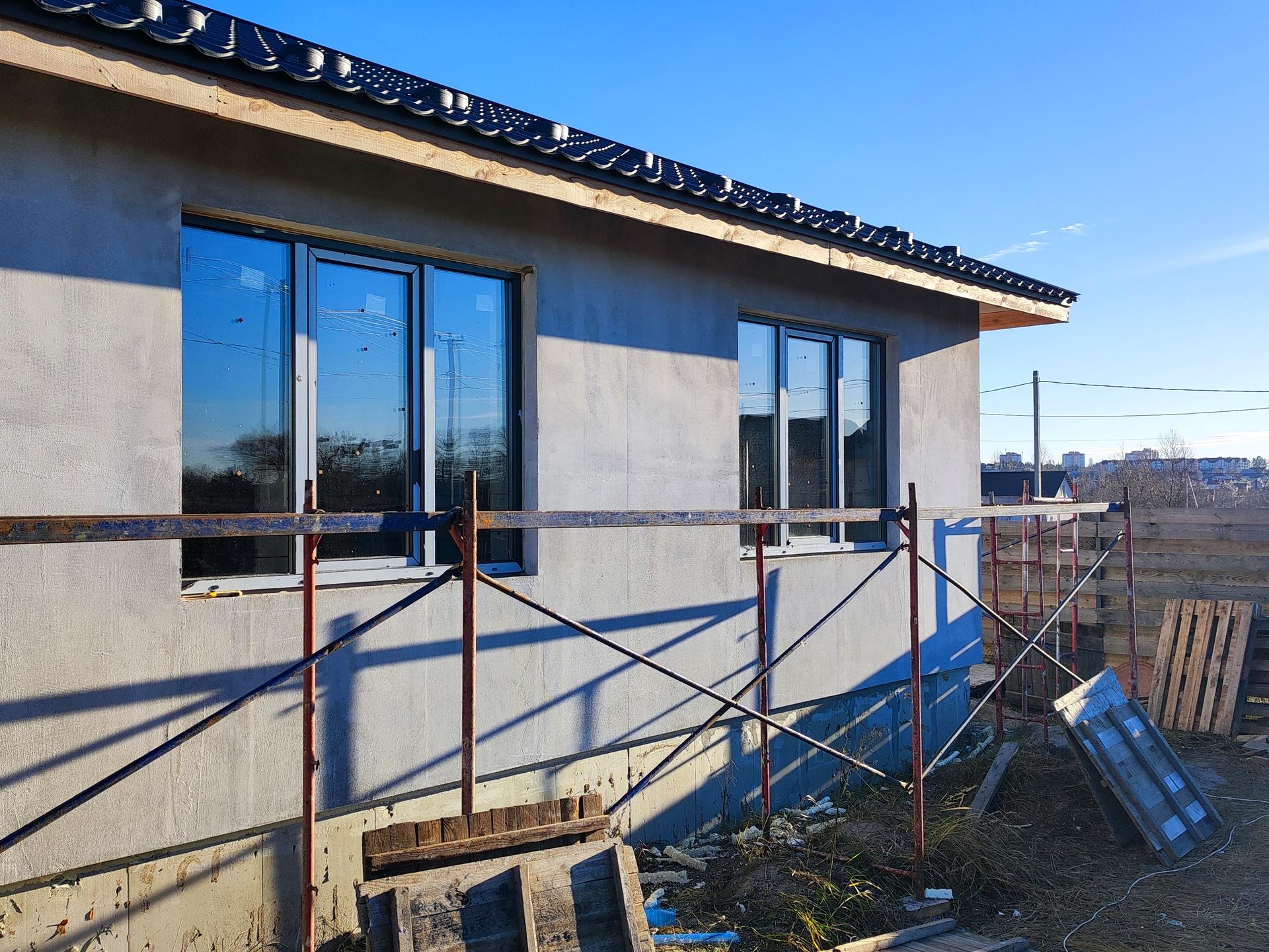 Ділянка 4,2 сот. Площа 92 м2. Один поверх. 2 спальні ×16 м2. Два сенвузли. Кабінет 10 м2. Кухня 30 м2.