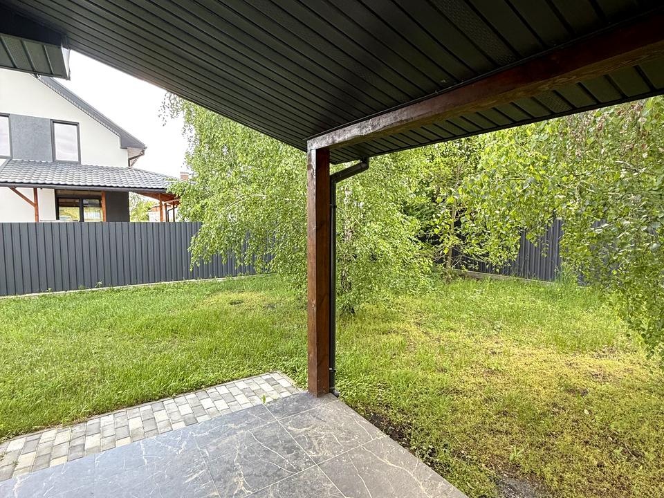 Вихід з кухні на велику терасу. Паркан по периметру з автоматичними воротами. Бруківка+ зелені насадження.