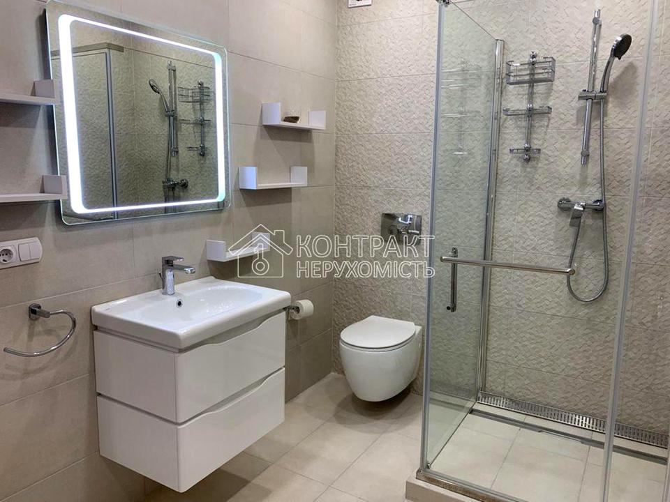 • Сучасна стильна ванна кімната: душ, раковина, унітаз — усе нове та акуратне.