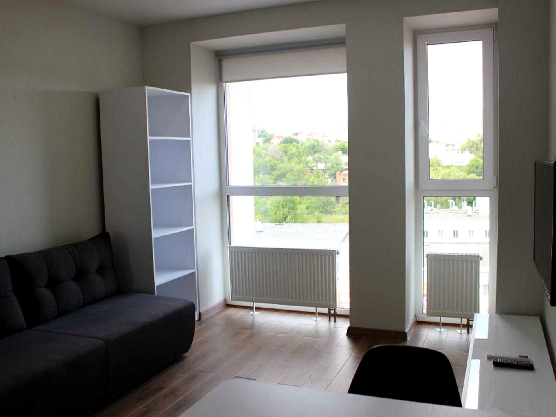Квартира повністю мебльована та оснащена всією необхідною технікою: простора вбудована шафа-купе, диван, холодильник, телевізор, кондиціонер, пральна машина, електрочайник. Із вікон відкривається гарний панорамний краєвид на парк Шевченка.