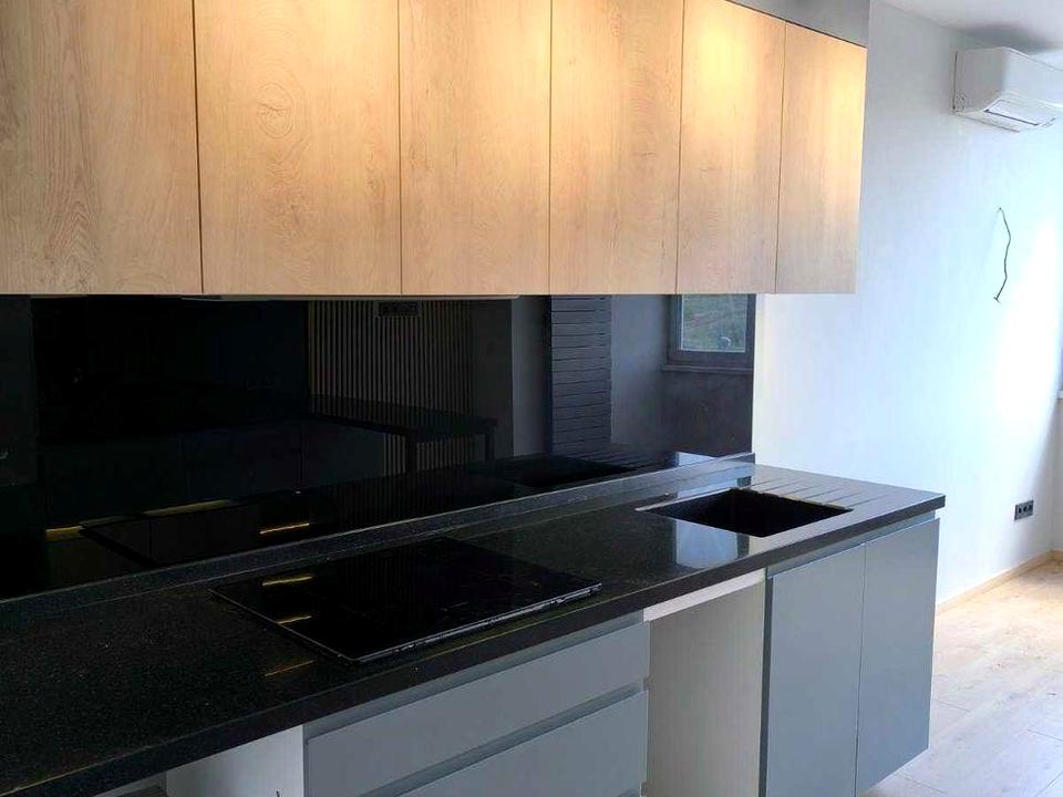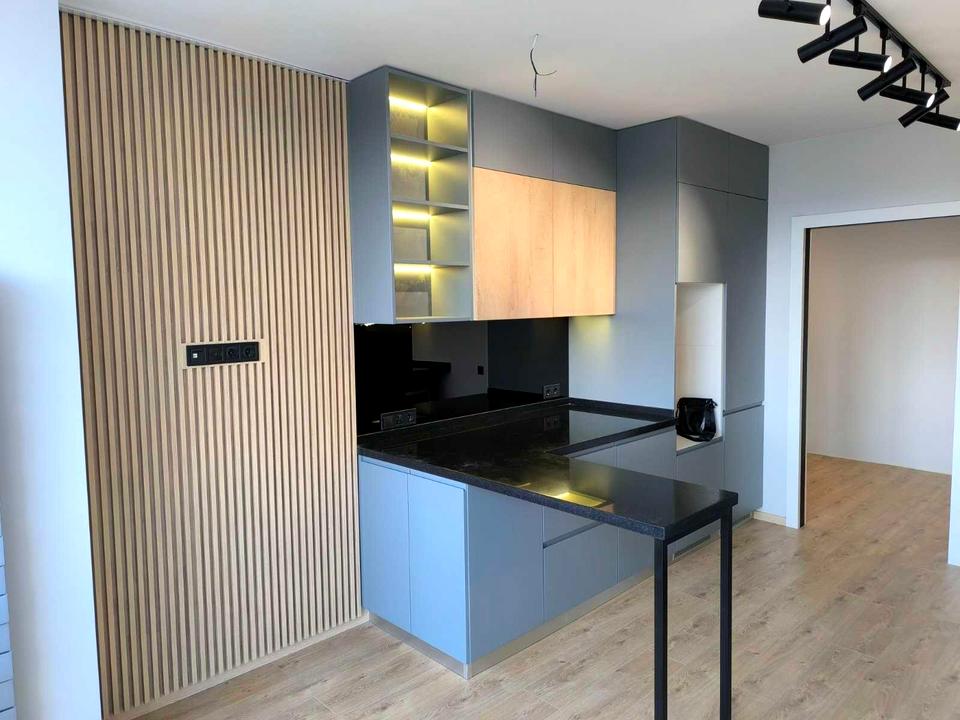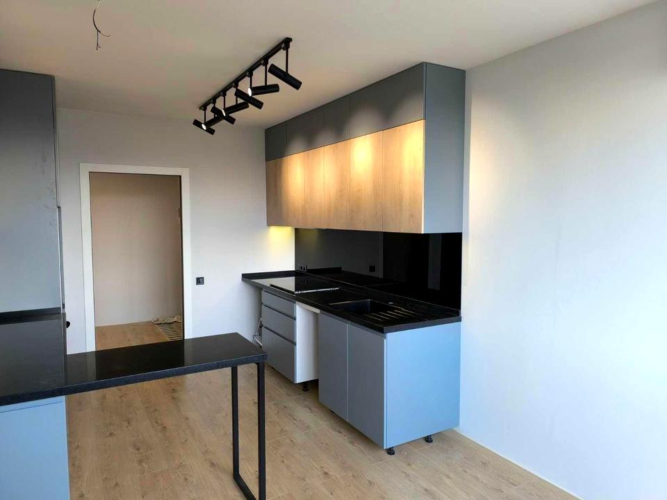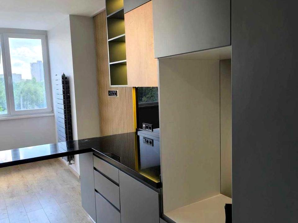 На кухні корпусні меблі, з вбудованим холодильником і варильною поверхнею, м'яких меблів немає.