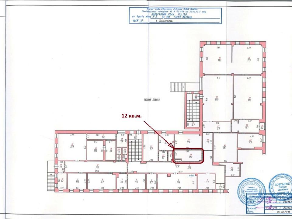 Приміщення Площею 12 м.кв., правильної прямокутної форми, кабінет без вікон. Цілодобовий доступ. Санвузол на поверсі. Без опалення. Без меблів.