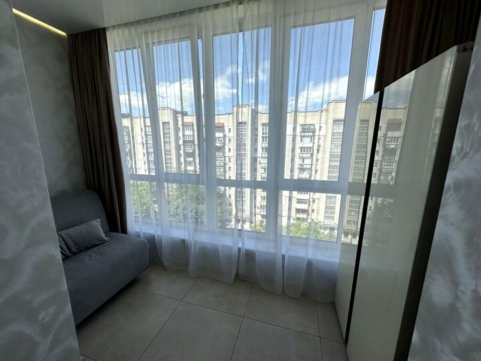 Панорамні вікна : квартира одностороння з великою лоджією, яка переходить у кухню, що наповнює простір природним світлом.