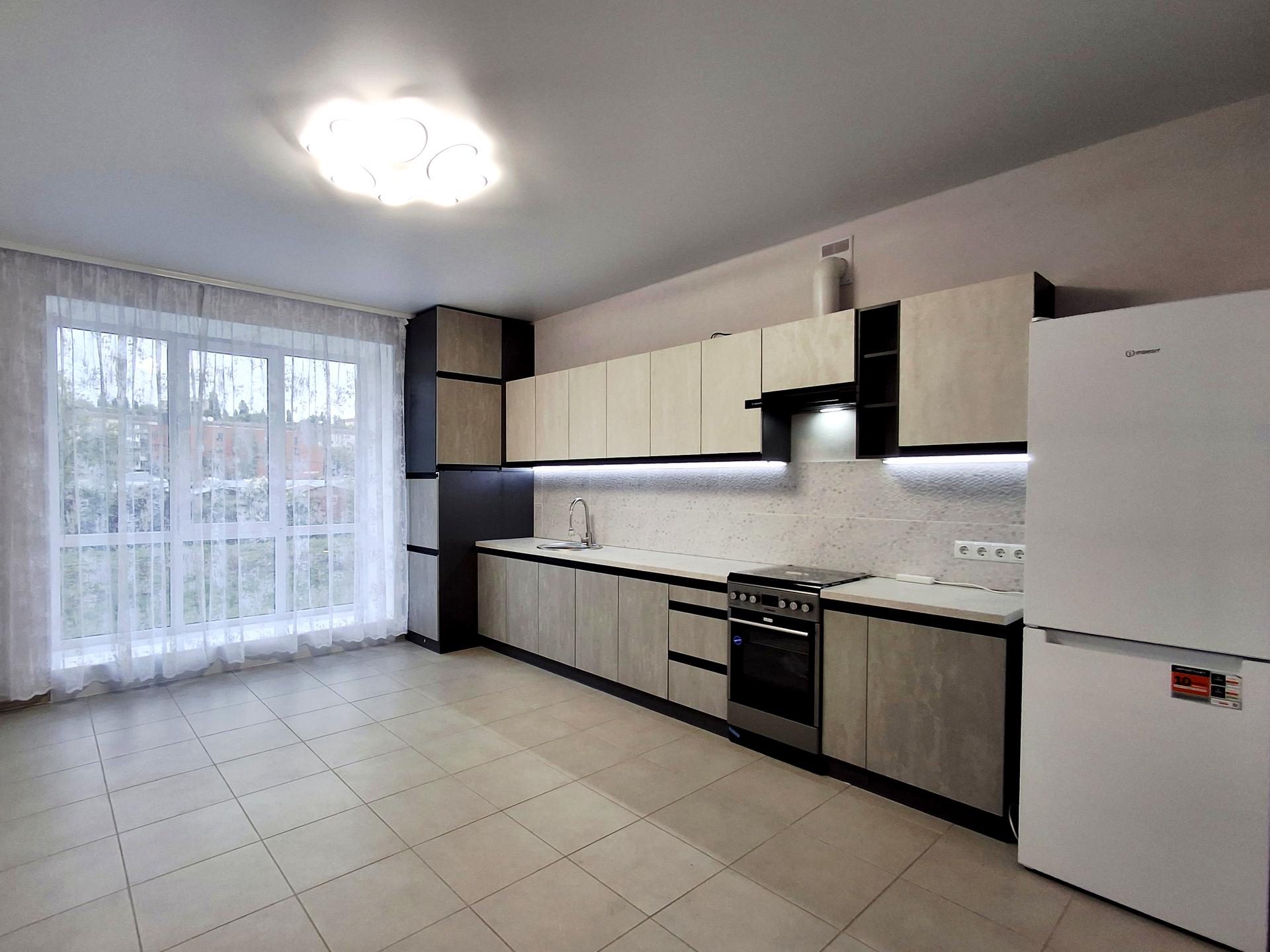 Велика кухня з панорамним вікном.
