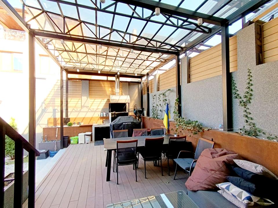 Сучасний Танхаус складається з 2-х поверхів, площа 309/77.4/52.3 м.кв. в себе включає: кухня вітальня 52.3 м.кв., 5 спальні (в 2-х спальнях гардероб, в інших великі шафи), 3 санвузли на кожному поверсі, кабінет, більярдна, цоколь (який облаштований як спортивний зал і хоз. приміщення, бойлерна). Дуже якісний і сучасний ремонт з дорогих матеріалів і сучасною дорогою технікою. (на фото усе видно).