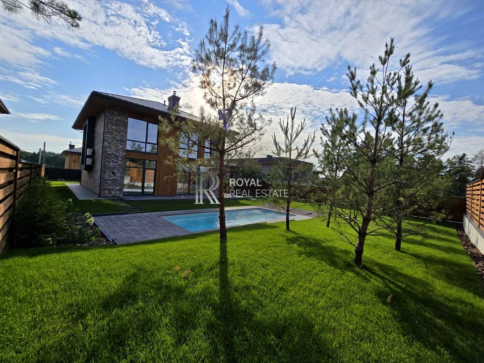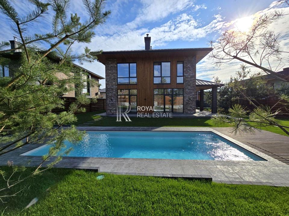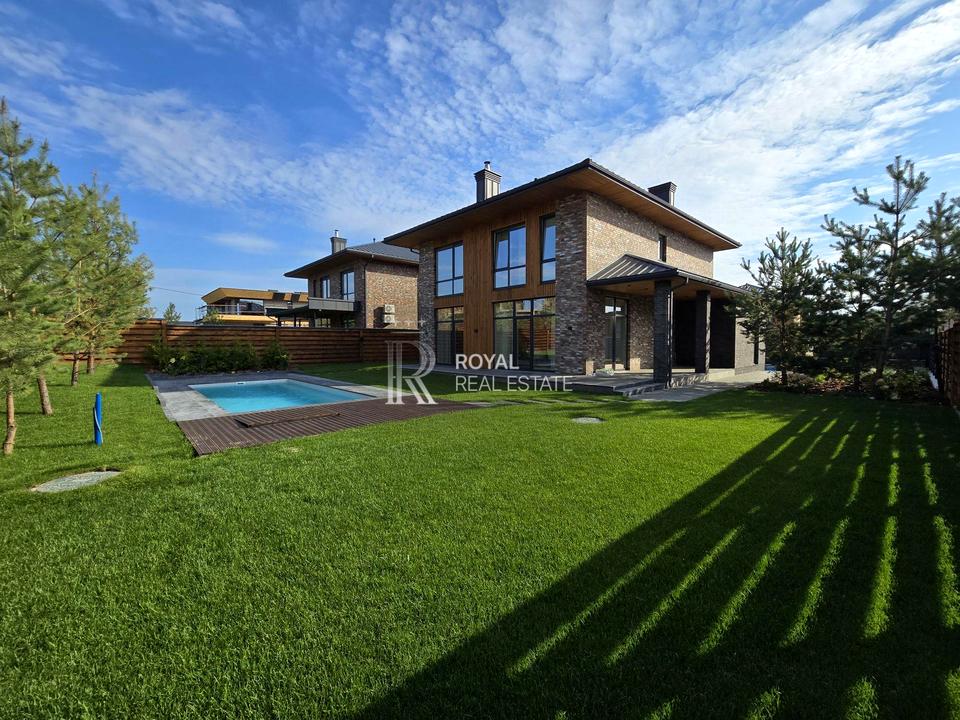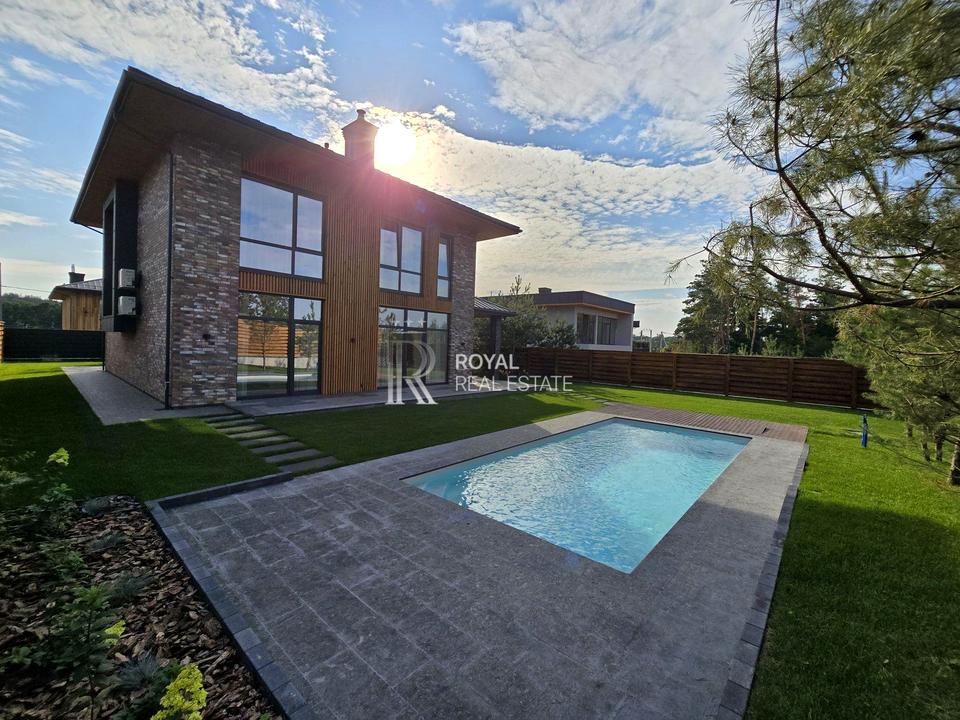 Пропонується до продажу стильний цегляний будинок площею 225 м² з новим дизайнерським ремонтом та власним басейном. Знаходиться у закритому котеджному містечку з охороною, в Обухівському районі, всього 8 км до Києва — зручний та швидкий доїзд по Новообухівській трасі.
