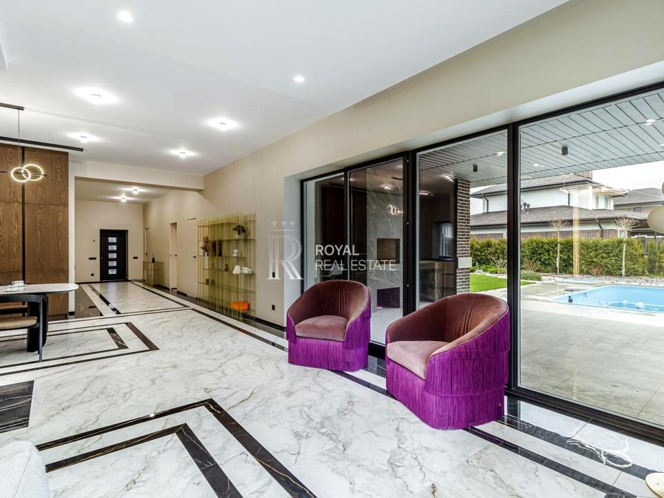 Будинок, 2 поверхи, 5 кімнат. Площа ділянки 10 соток. Планування кімнат Суміжно-роздільне. У будинку є Підігрів підлоги, Камін, Ванна, Автополив, Газон, Гараж, Тераса, Басейн. Загальний стан будинку - З ремонтом. Працює без світла - вода, газ, опалення, інтернет, резервне живлення (акумулятори/генератор). Без комісії
