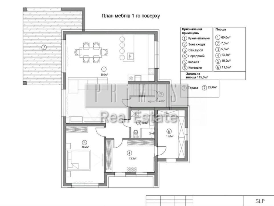 1 поверх: прихожа з вхідною гардеробною 13 м2, гостина з іншим світлом кухня 60 м2 з виходом на терасу 30 м2, сан узел, окрема кімната, котельня.