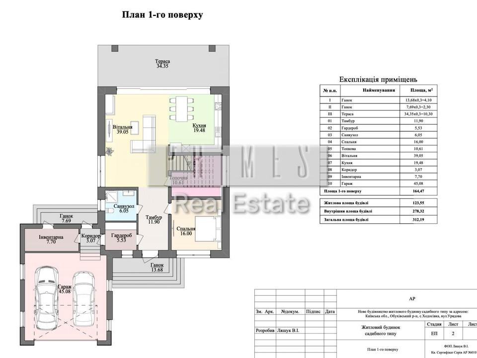 1 поверх — кухня – вітальня з каміном та виходом на терасу, гостьова спальня/кабінет, гардеробна кімната, санвузол, котельня, передпокій, гараж, кладова.