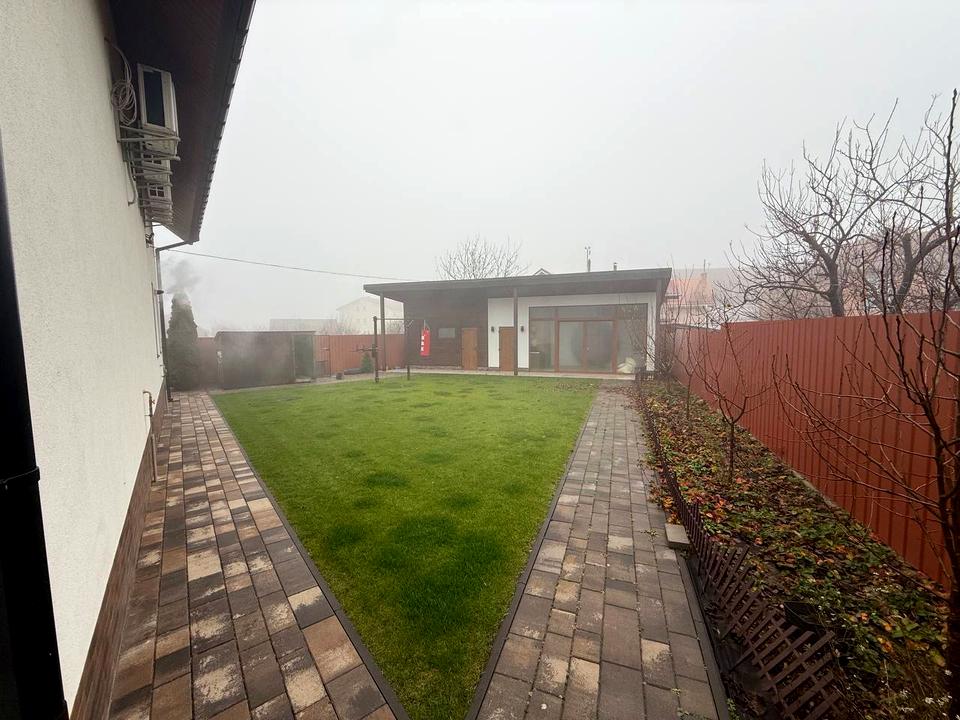 доглянута ділянка, акуратний двір, навіс на 2 авто, навколо — зелень, приватність і відчуття простору всередині будинку.