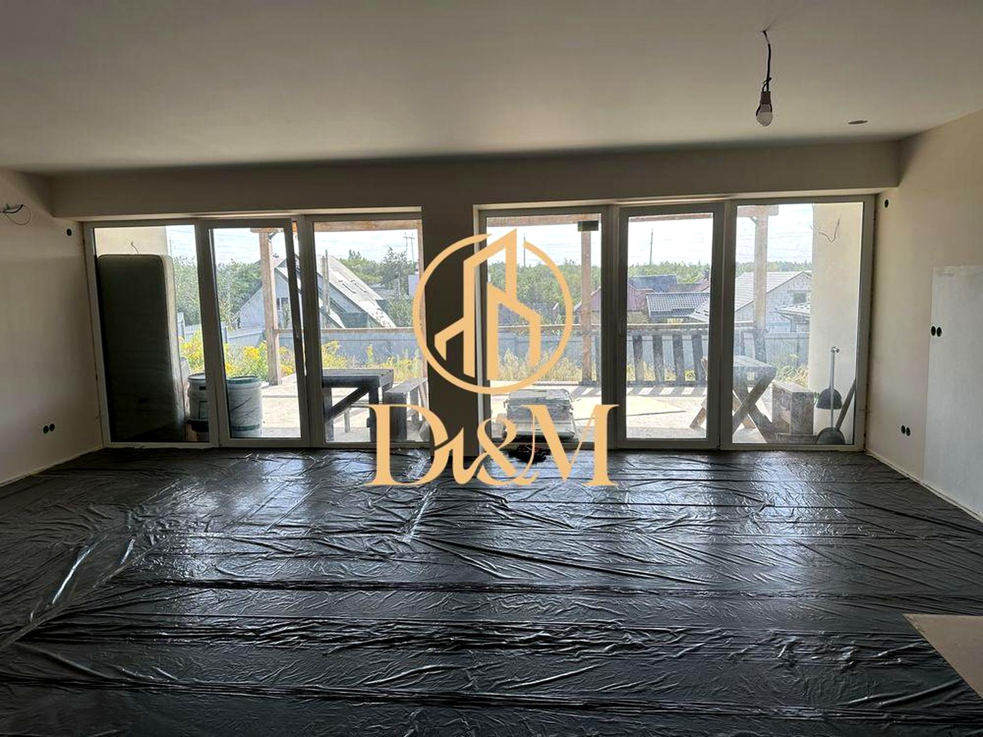 Другий поверх зроблений з піноблоків. Тут є коридор, гардеробна, дві спальні з панорамними вікнами та виходом на терасу, санвузол: ванна+туалет. Каналізація – септик, працює. Тераса зроблена.