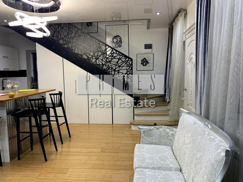 відкрита кухня з острівним баром, сучасною вбудованою кухнею MERX, з мраморними поверхнями, вбудована техніка індукційна плита, посудомийка сходи на мансарду системи зберігання.