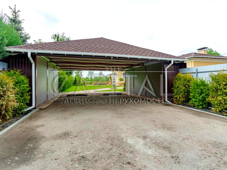 14 соток із доглянутим ландшафтним дизайном, автоматичним поливом (включаючи крапельний для туй і квітів), паркування на 10 авто, частина з яких — під навісом.