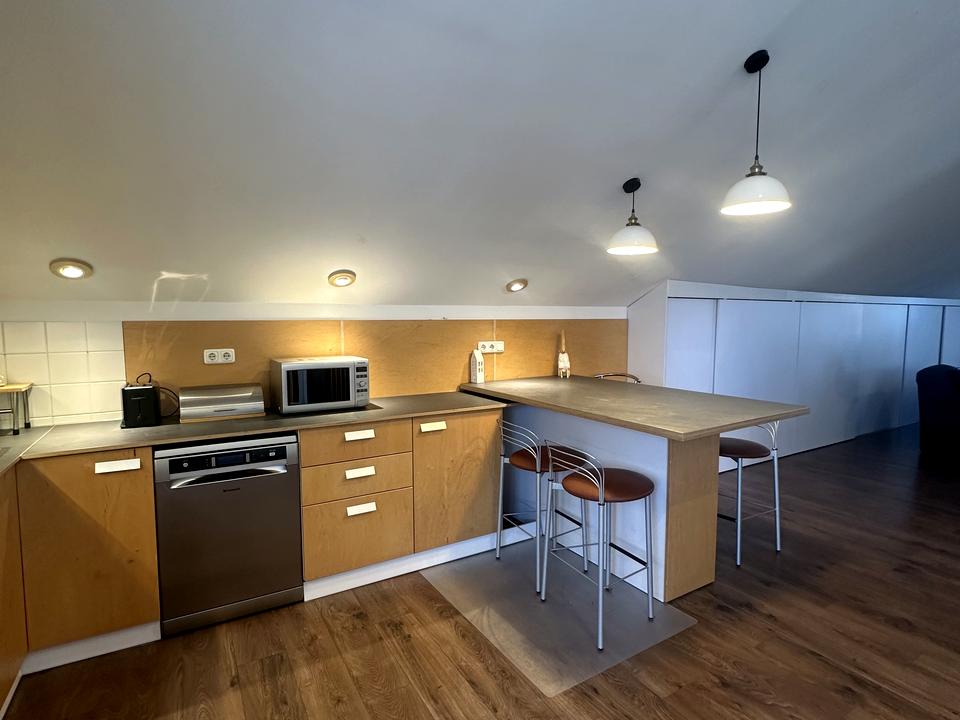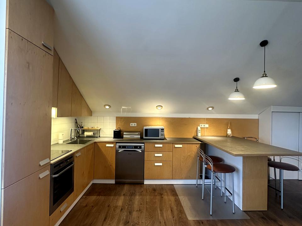 Кухня виконана у сучасному стилі з великою робочою поверхнею та барною стійкою, де зручно снідати або працювати з ноутбуком