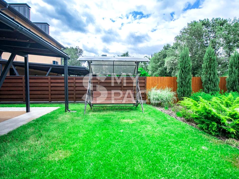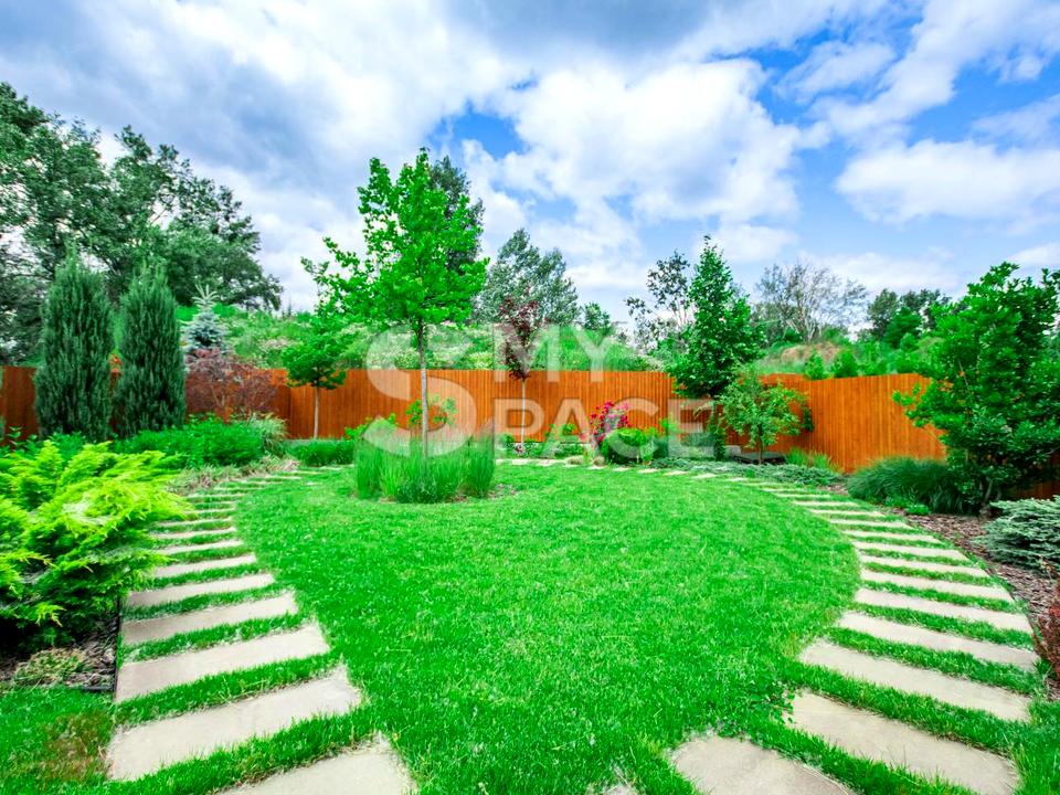 Ділянка будинку з ландшафтним дизайном та авто-поливом.