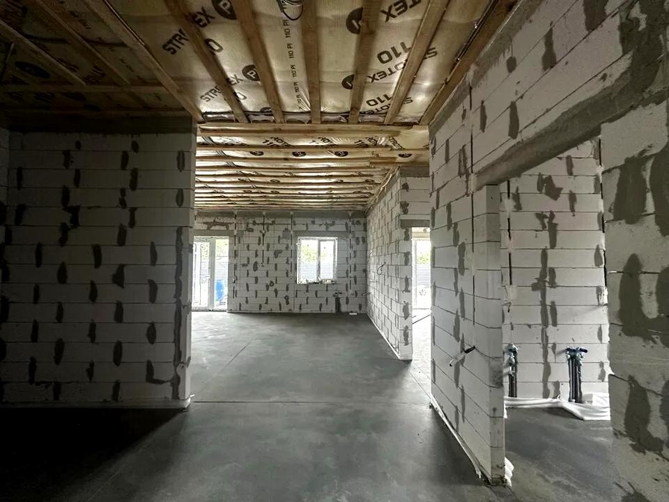 В будинку простора кухня- вітальня з панорамними вікнами та виходом у у двір, 3 кімнати, гардеробна, 2 с/в, госпприміщення, простора тераса.