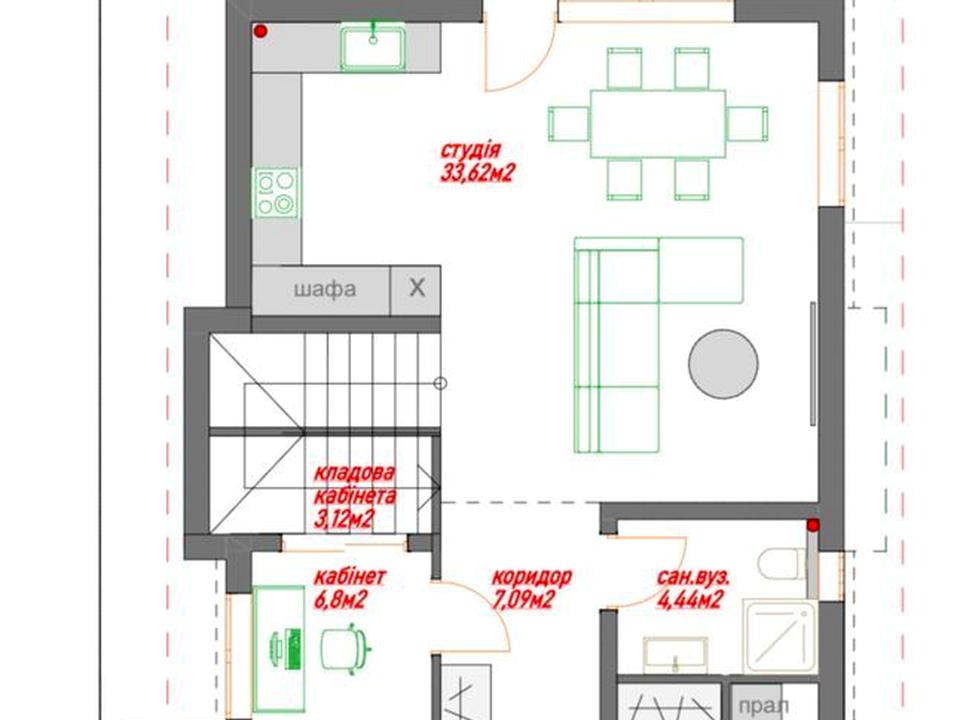 1 поверх: кухня-вітальня, кабінет, санвузол та котельня