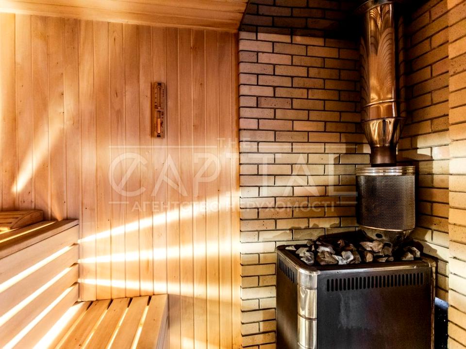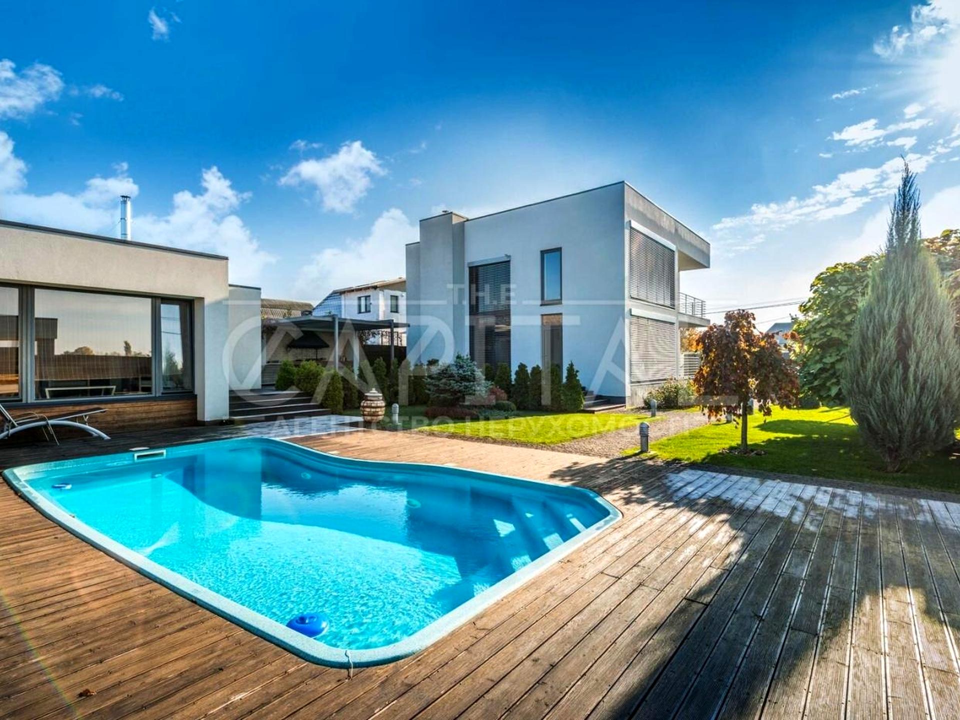 •Площа будинку 300 метрів. Окремо на ділянці: Сауна – 50 метрів, будинок охорони 15 метрів, тераси – 300 метрів